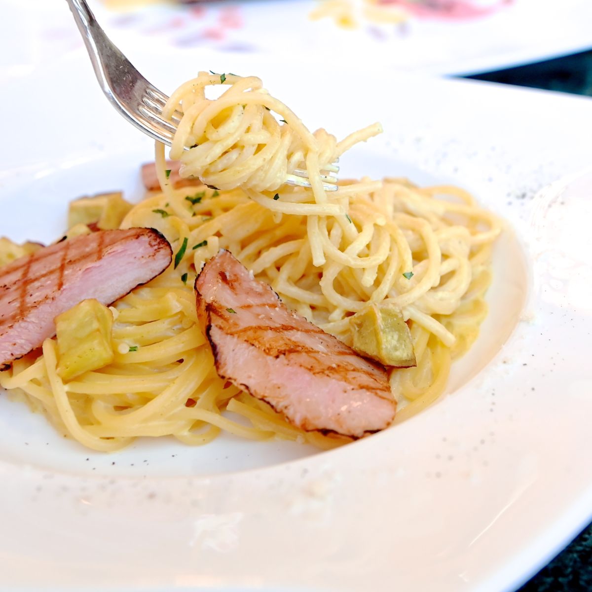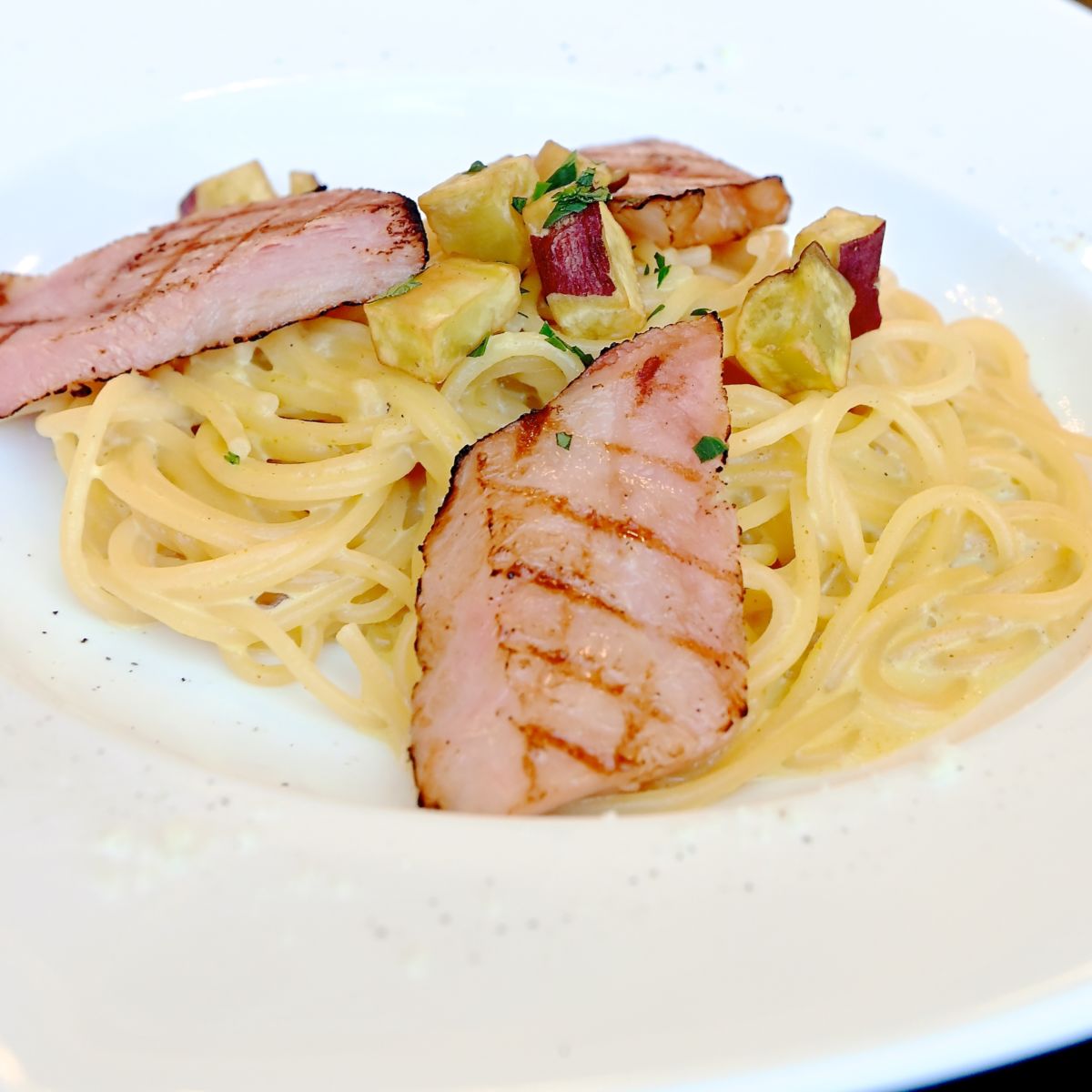 スパゲッティ 安納芋とベーコンのクリームソース アップ