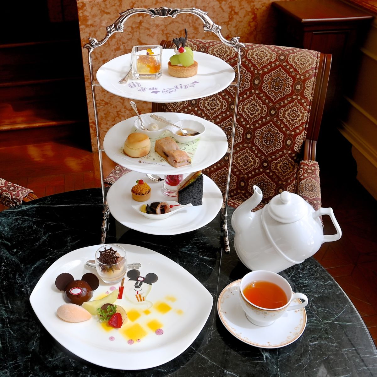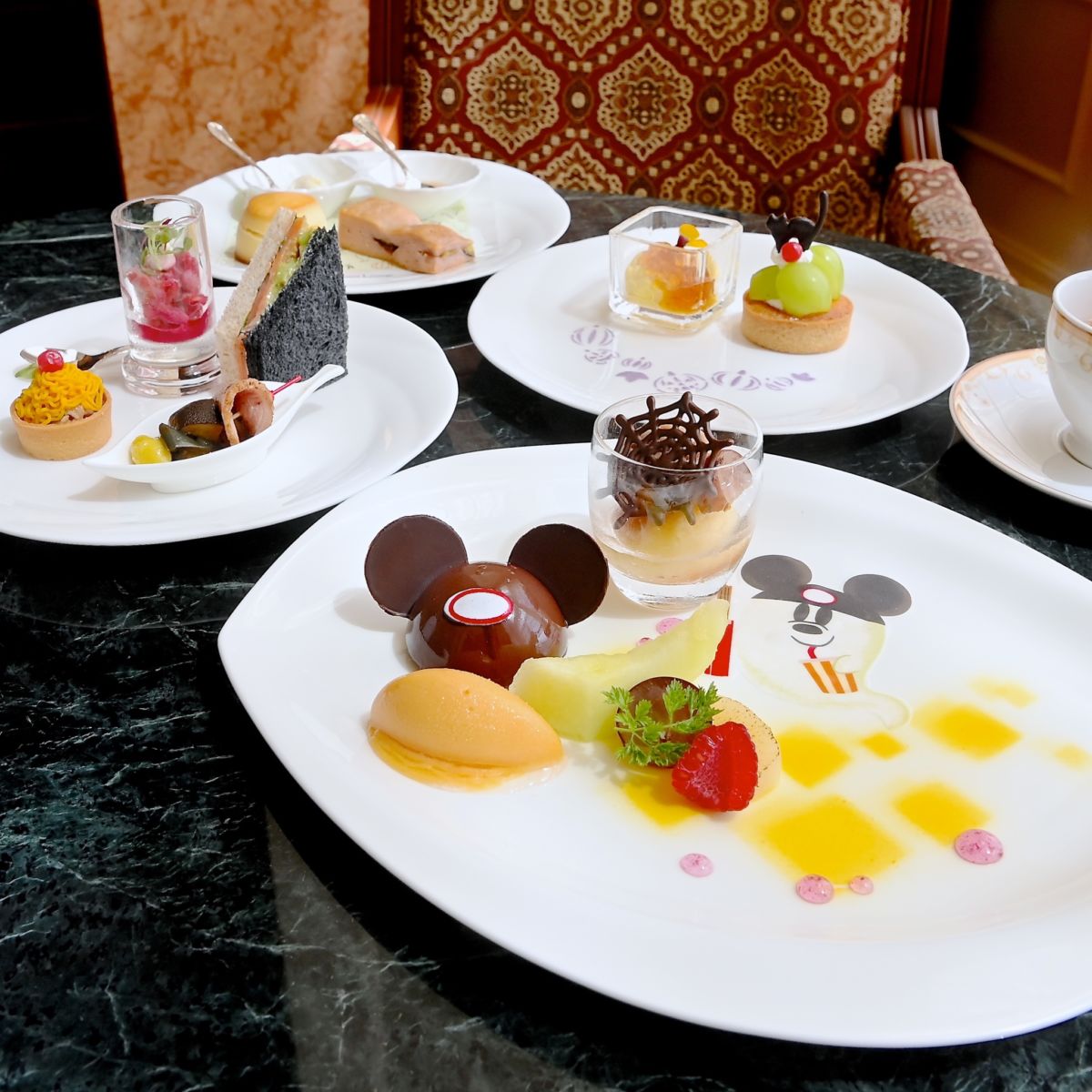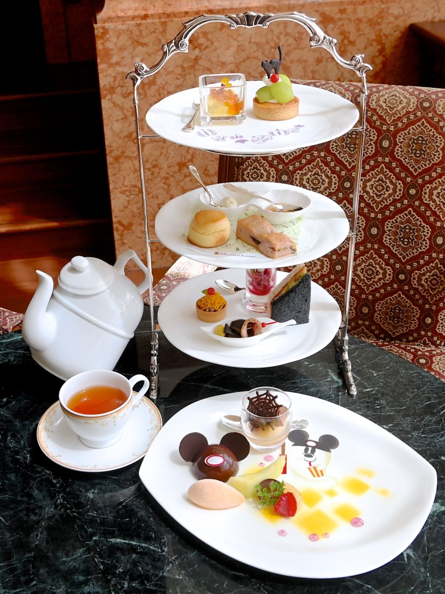 秋の味覚とかわいいミッキーおばけの絵柄が楽しめるドリーマーズ・ラウンジのハロウィーンアフタヌーンティーセット。