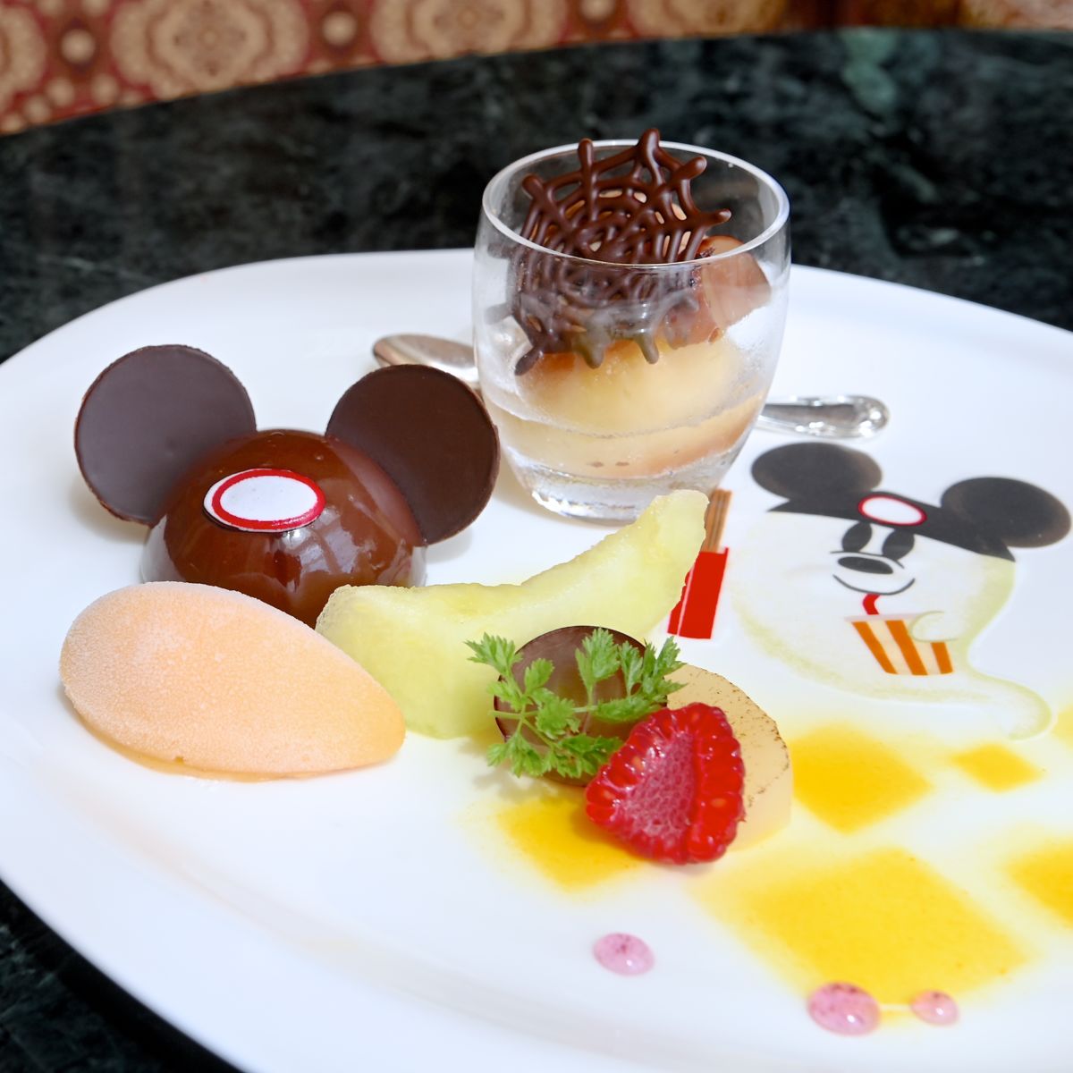 デザートプレートは、ミッキーイヤーハットをかぶり、チュロス、ドリンクを持ってリゾートを満喫しているミッキーおばけがデザインされています☆