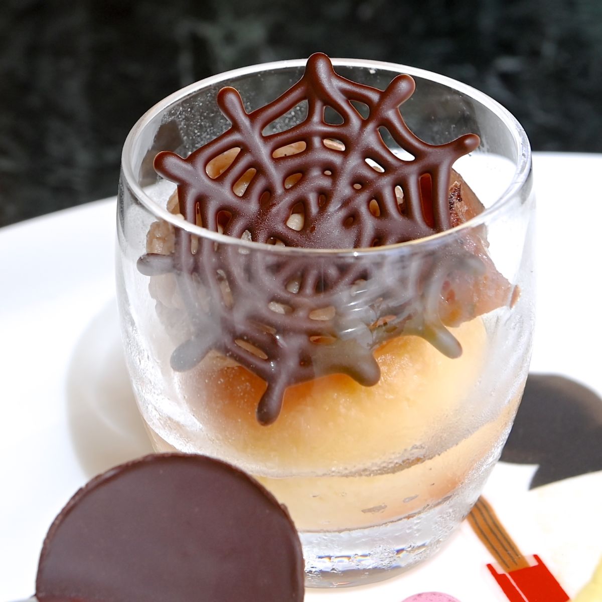 蜘蛛の巣型のチョコレートがトッピングされたグラスデザート。