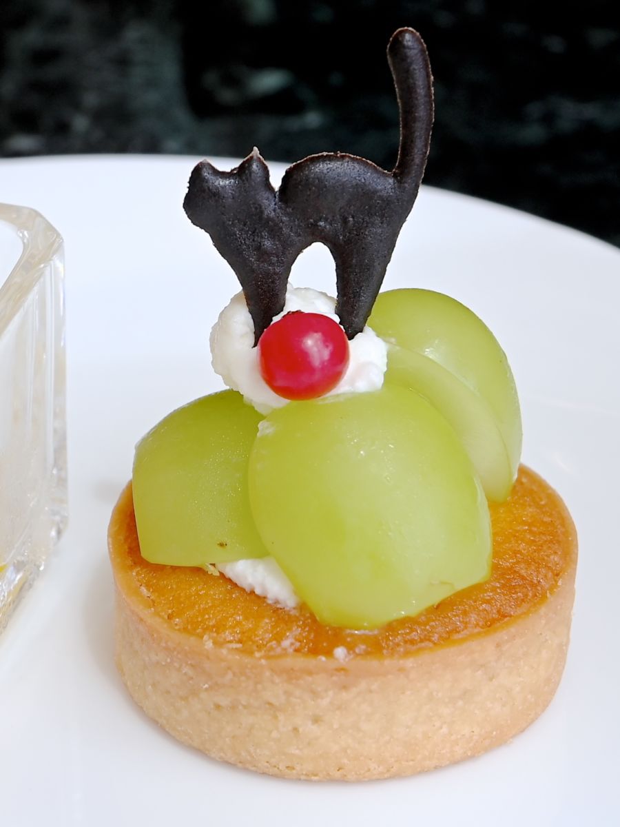 マルメロとグレープのしっとりしたタルトにはハロウィーンらしく黒猫のラングドシャがトッピングされています。
