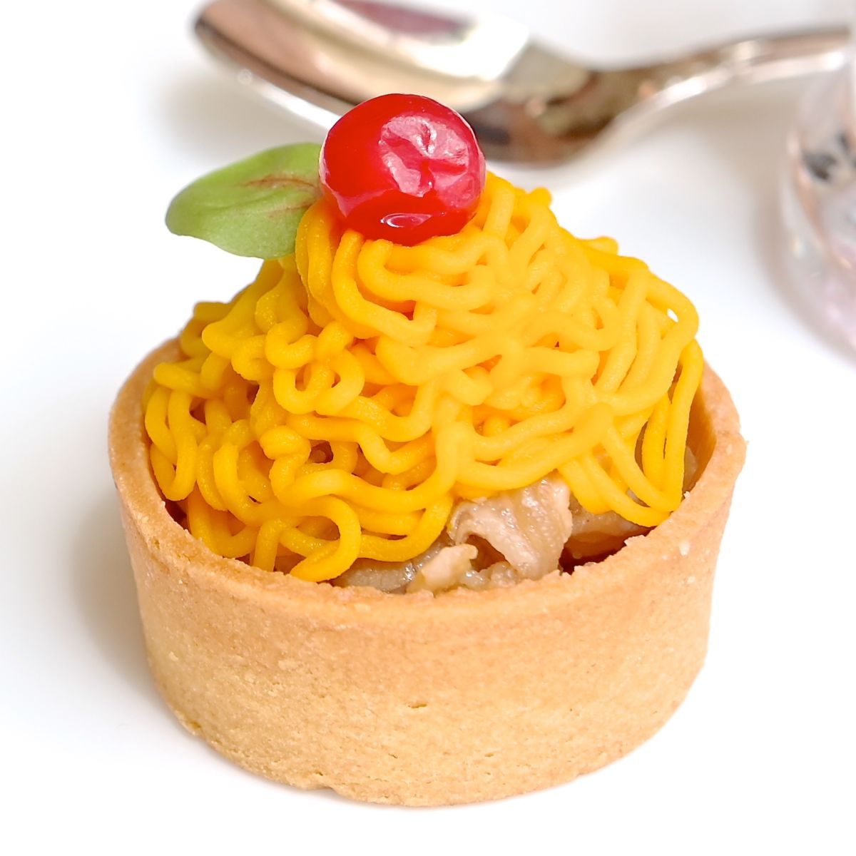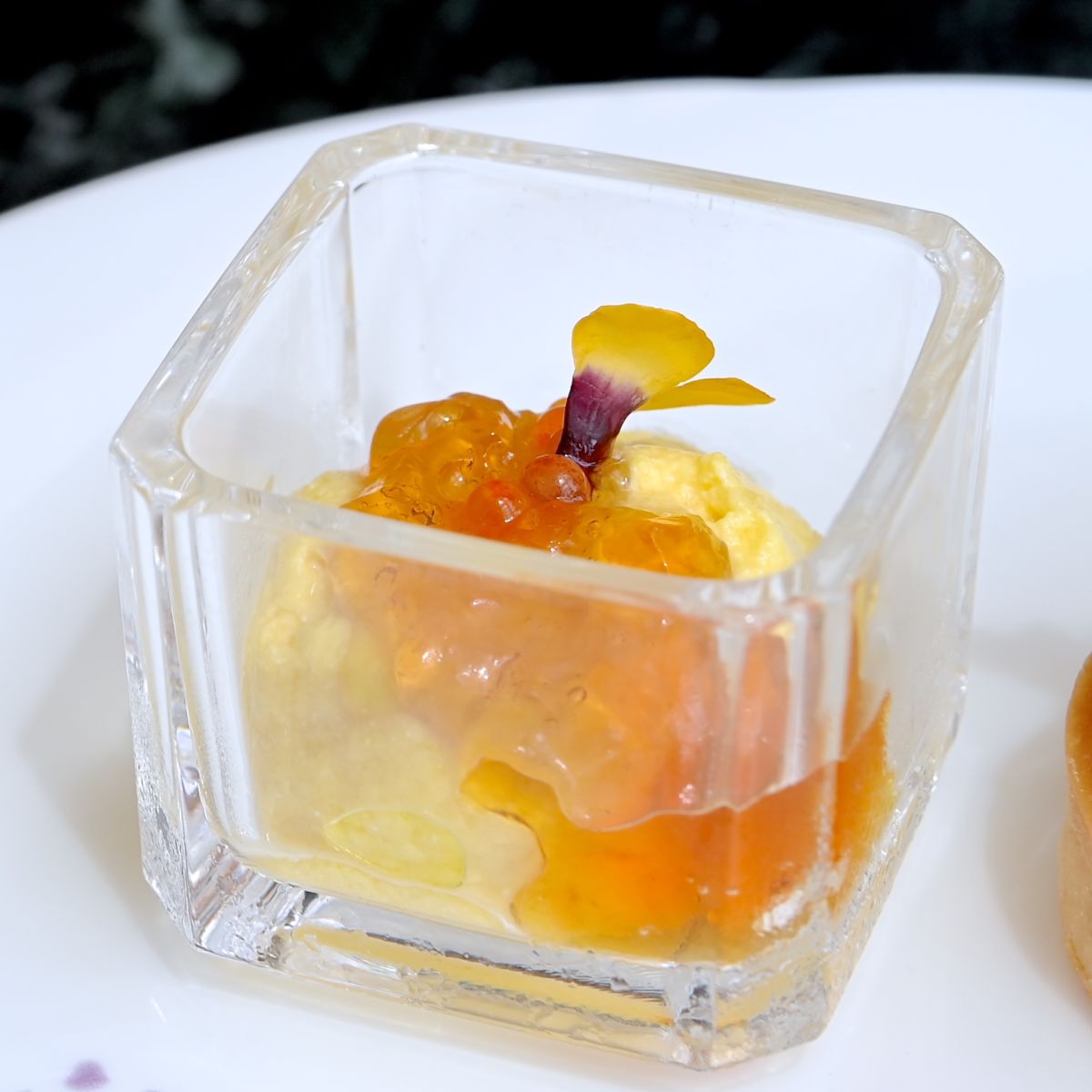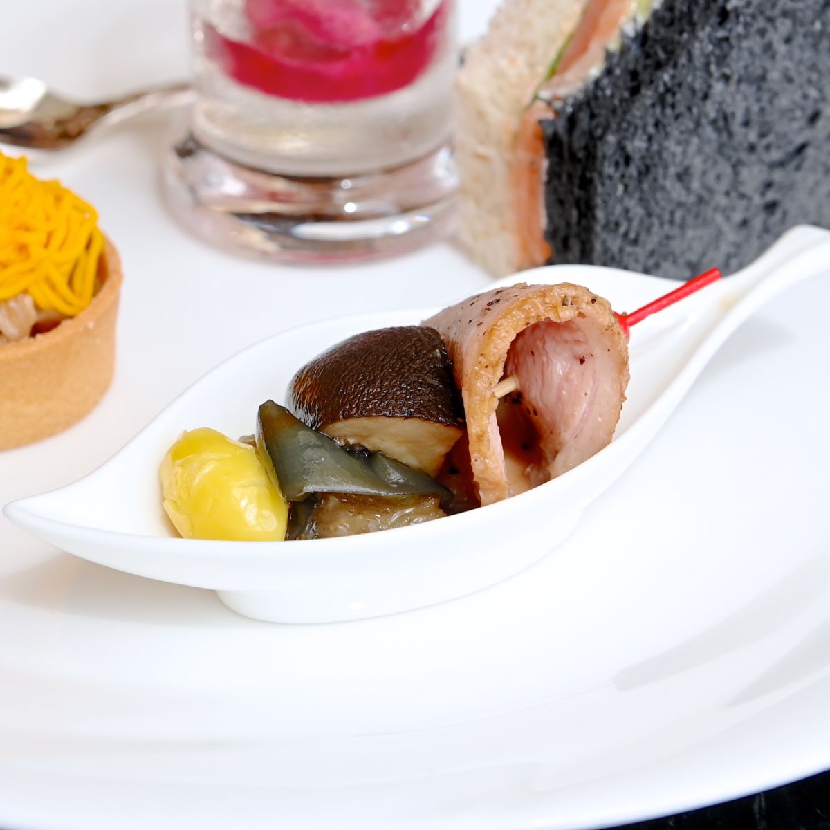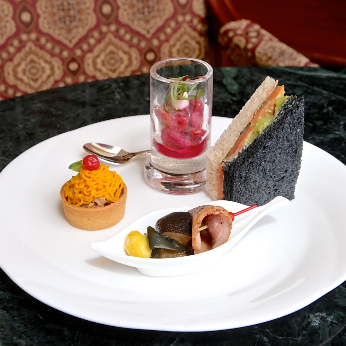 色あざやかな南瓜のクリーム、牛肉のマリネが楽しめる一口サイズのタルト。