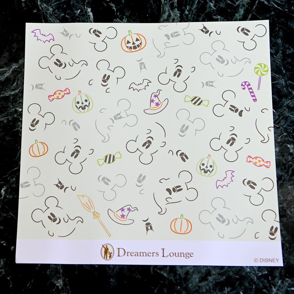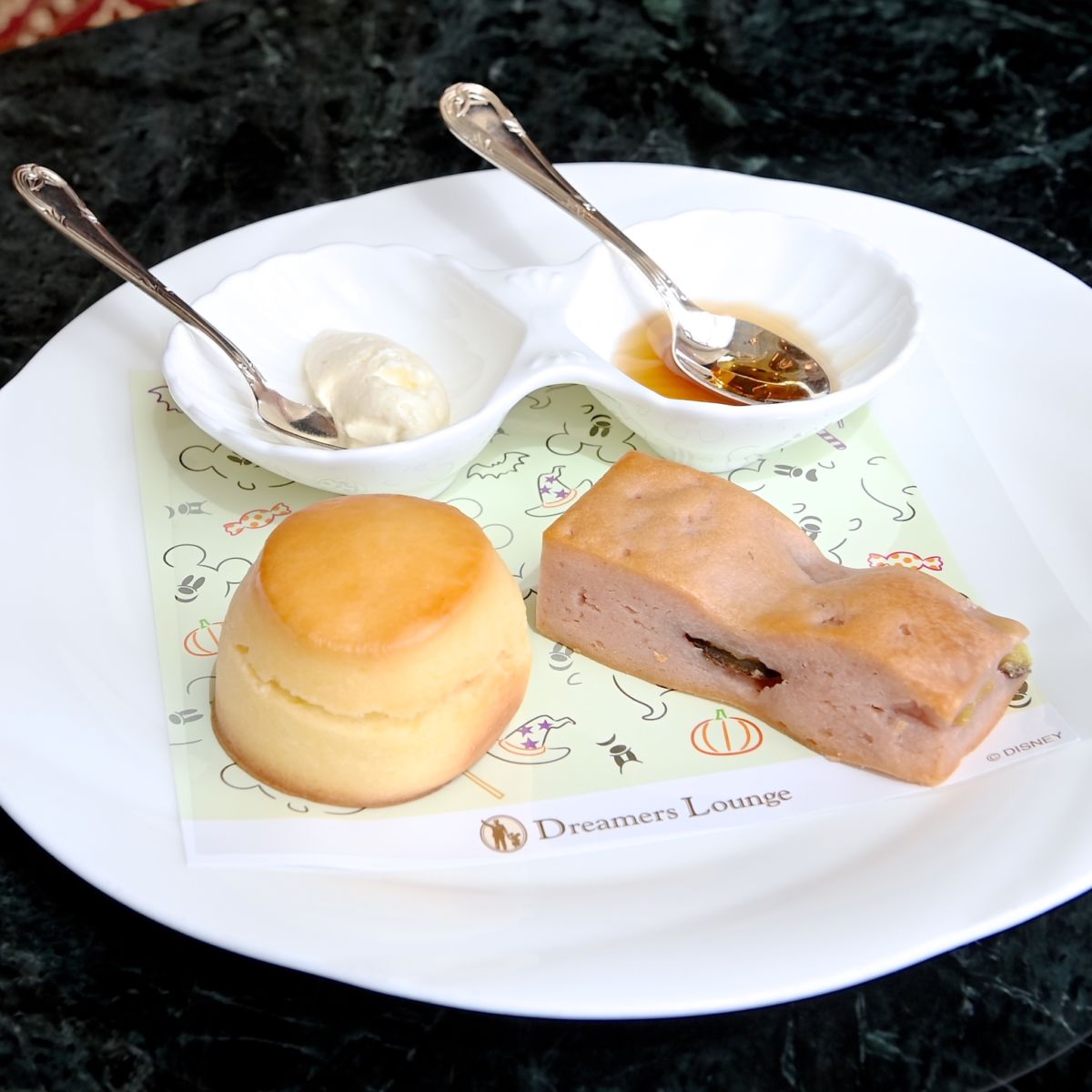 スコーンの下にはミッキーおばけやジャック・オー・ランタン、キャンディーなどの総柄とドリーマーズ・ラウンジのロゴがデザインされたされた敷紙も☆