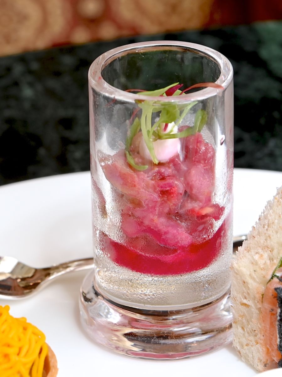 酸味の効いたザクロ、ビーツ、マグロのタルタル。