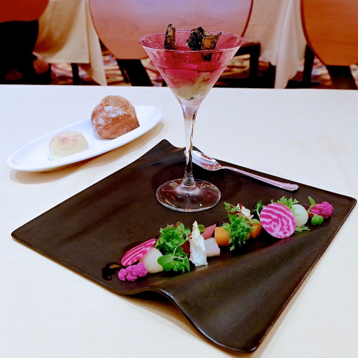 上にビーツのクリームやマスカルポーネ、サワークリーム、ビーツのパウダー、トルティーヤチップスがトッピングされ爽やか味わいが楽しめます☆