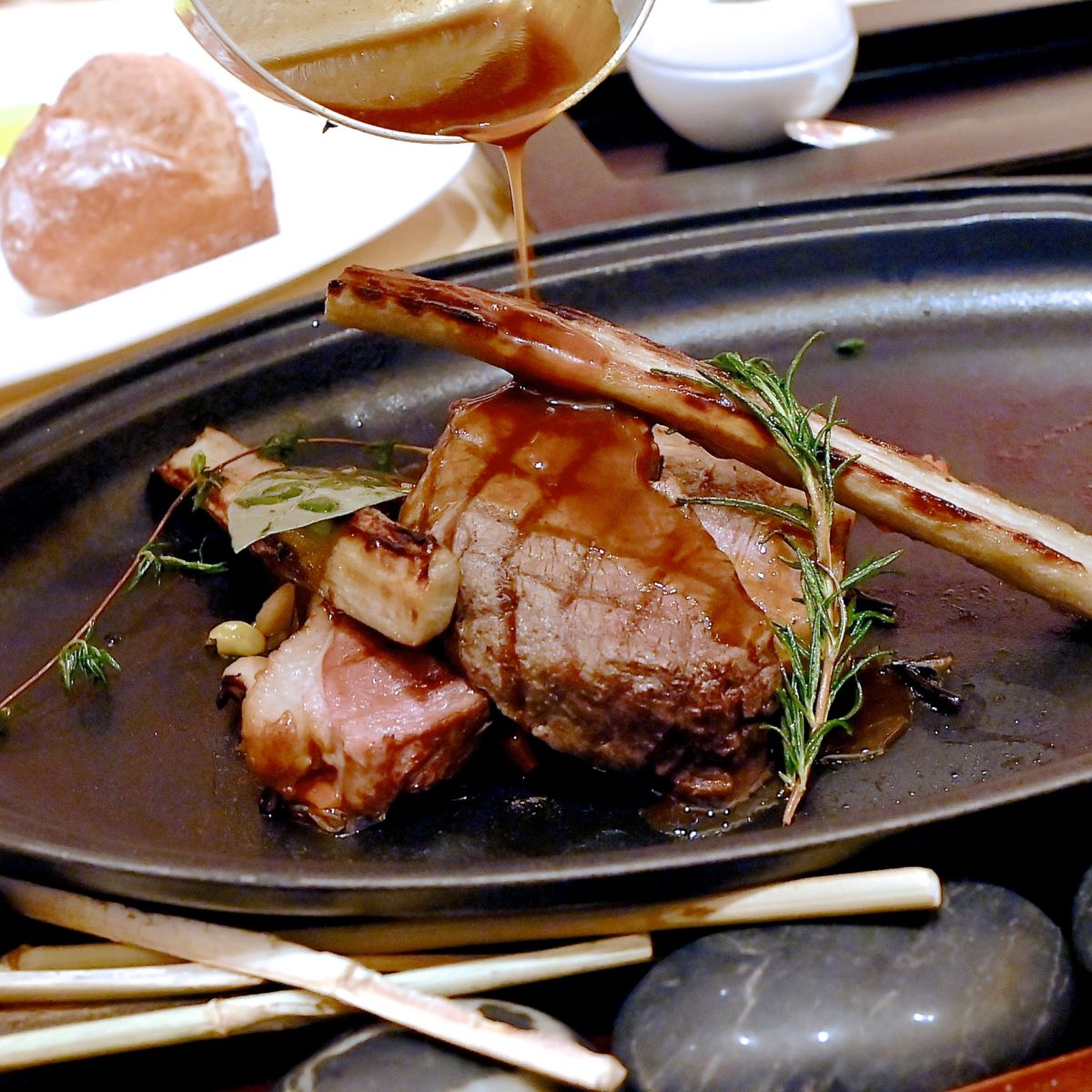 ・アドボソースでマリネしたプラチナポークのコンフィグリル レンズ豆の煮込みとジンファンデル香るチャツネソース