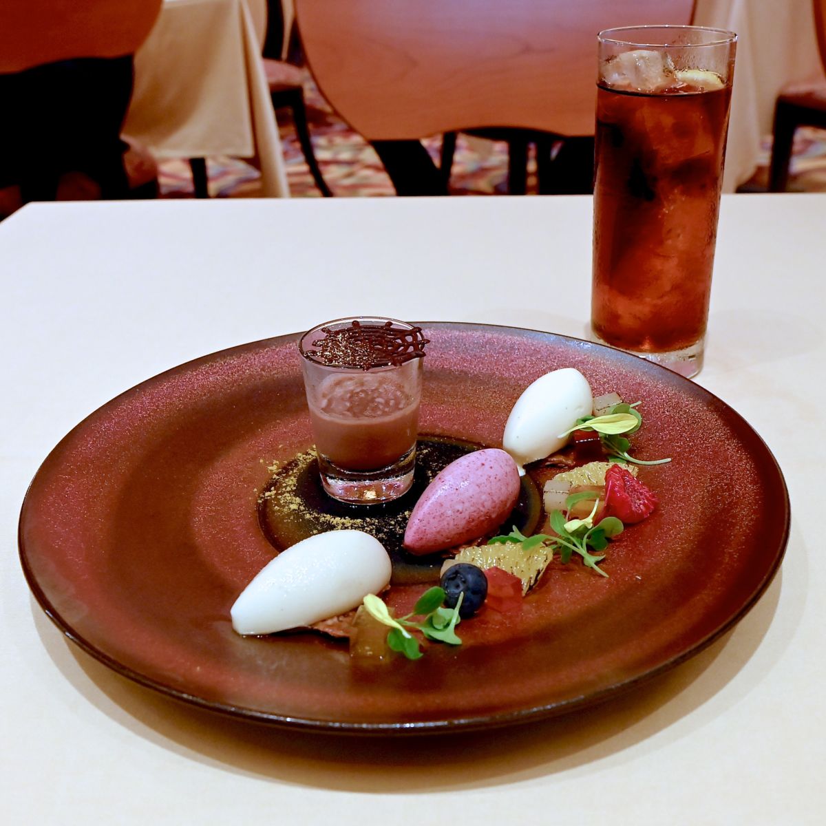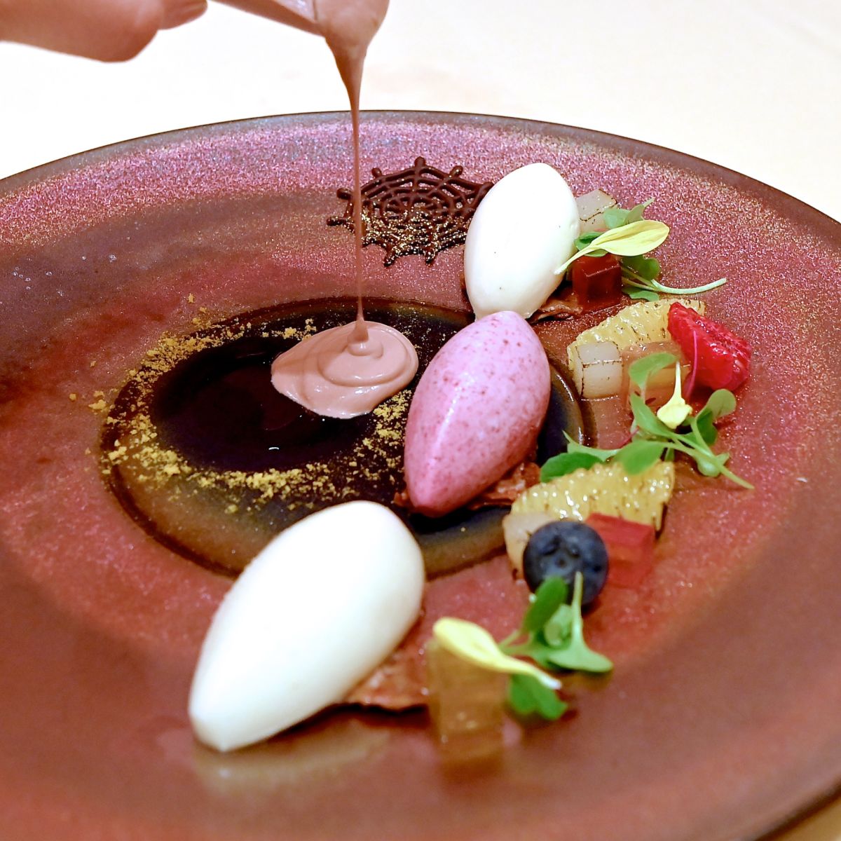 蜘蛛の巣のチョコレートが飾られたショットグラスにはオレンジ風味のチョコレートソース。