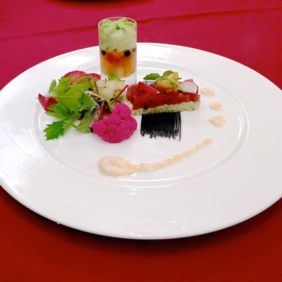 ・鮪のタルタルとバジル風味のクスクス、ガトー仕立て 海老のコンソメジュレ添え