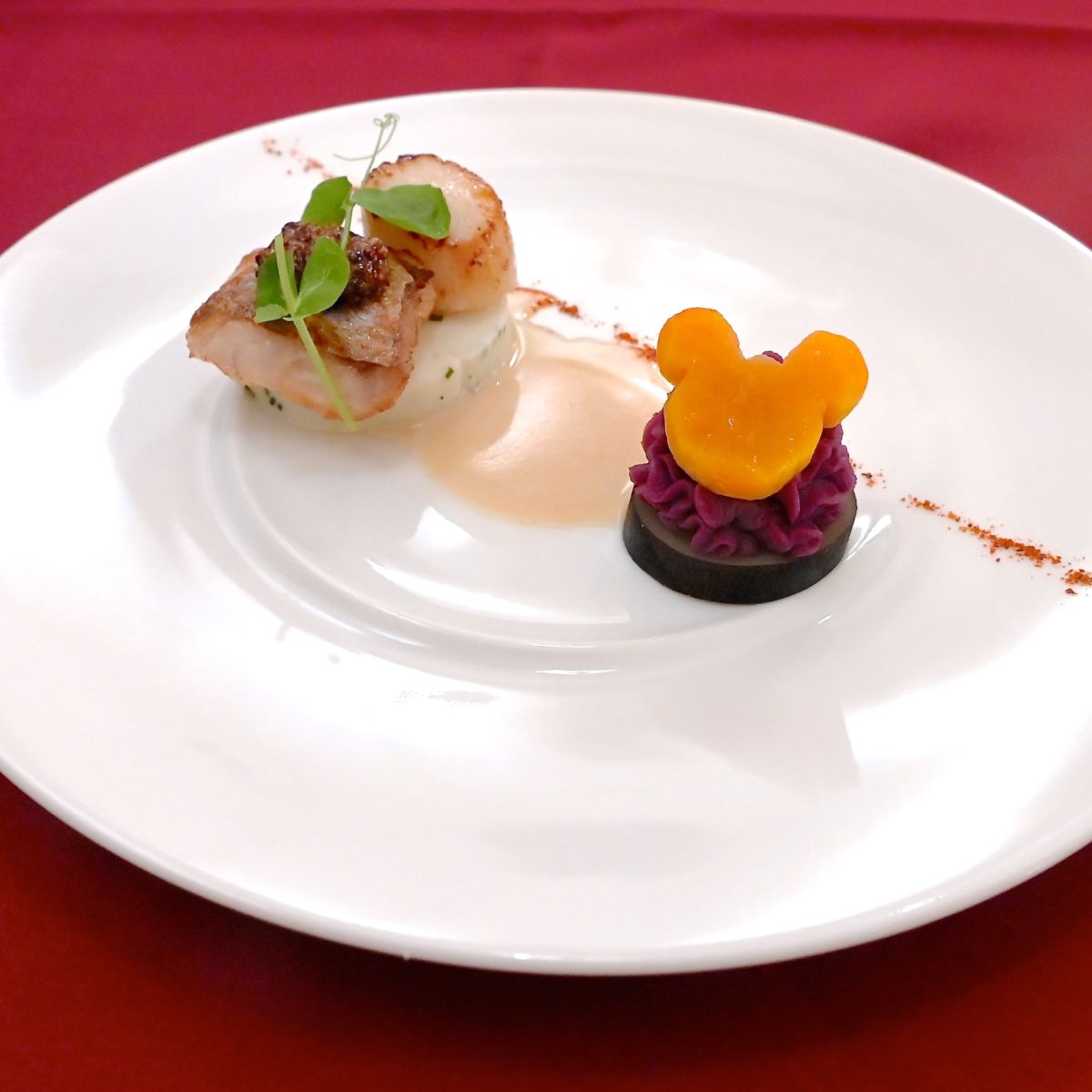 付け合せの黒大根には紫芋のピューレ、ミッキーシェイプのにんじんが☆