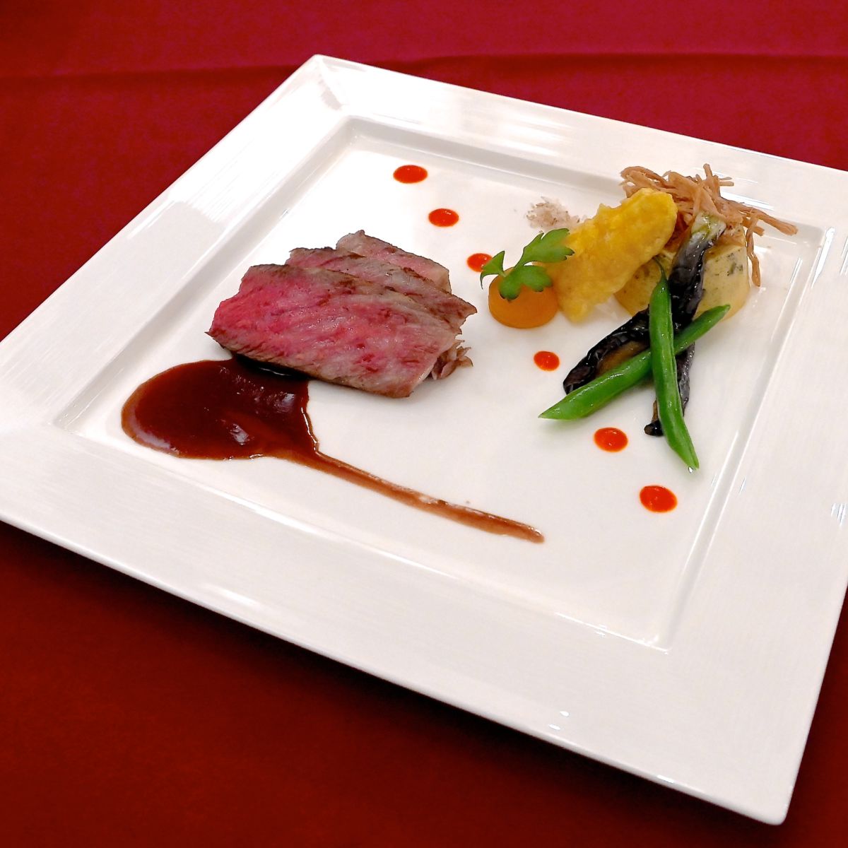 牛肉にあう赤ワインを使用したヴァンルージュソース、キノコ風味のお塩、パプリカのピューレでいただきます。