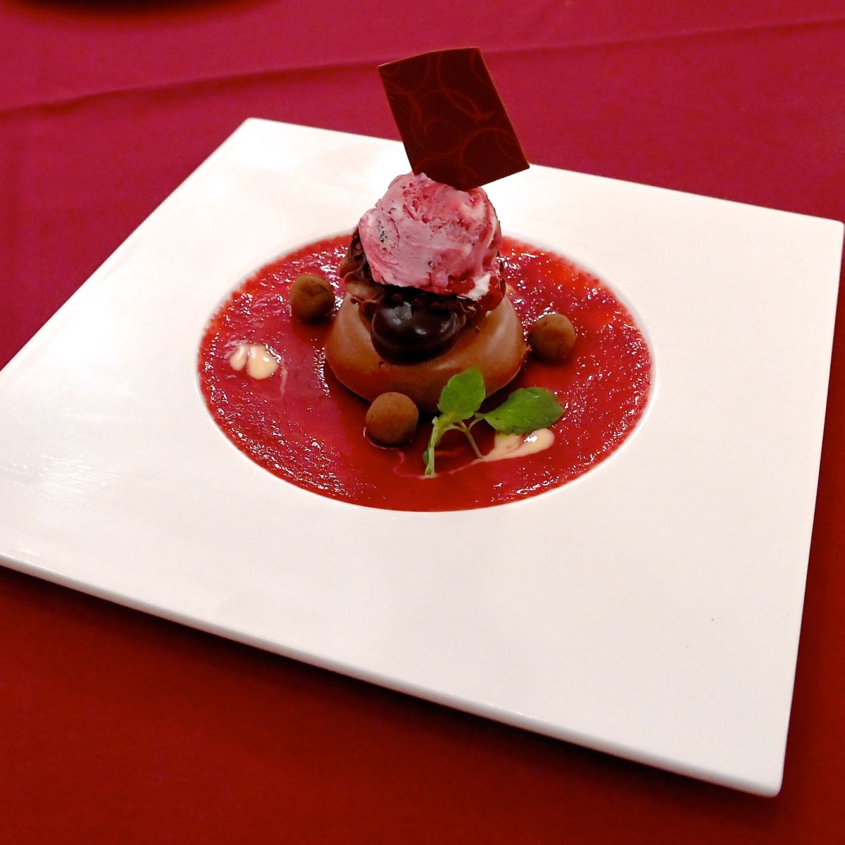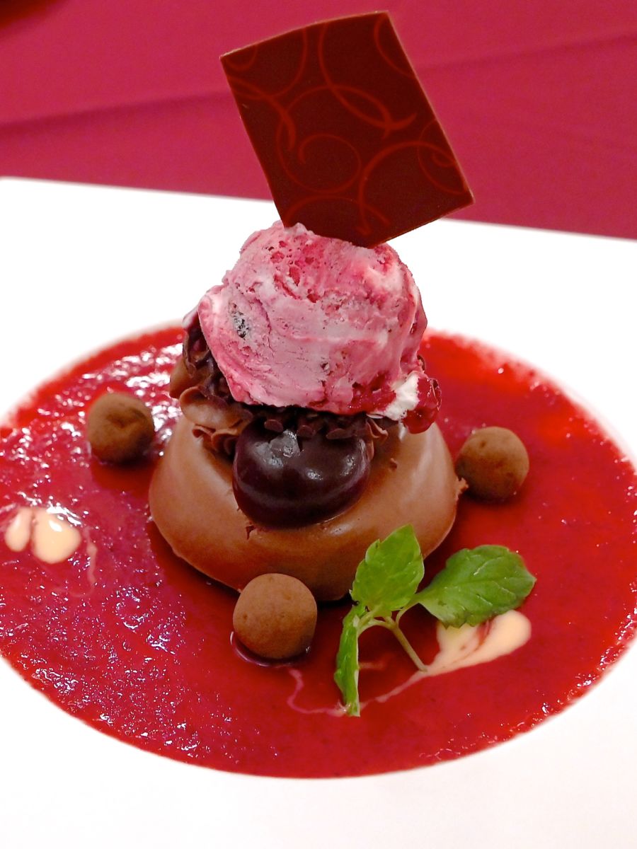 デザートは、濃厚なチョコレートムースとカシスアイス。