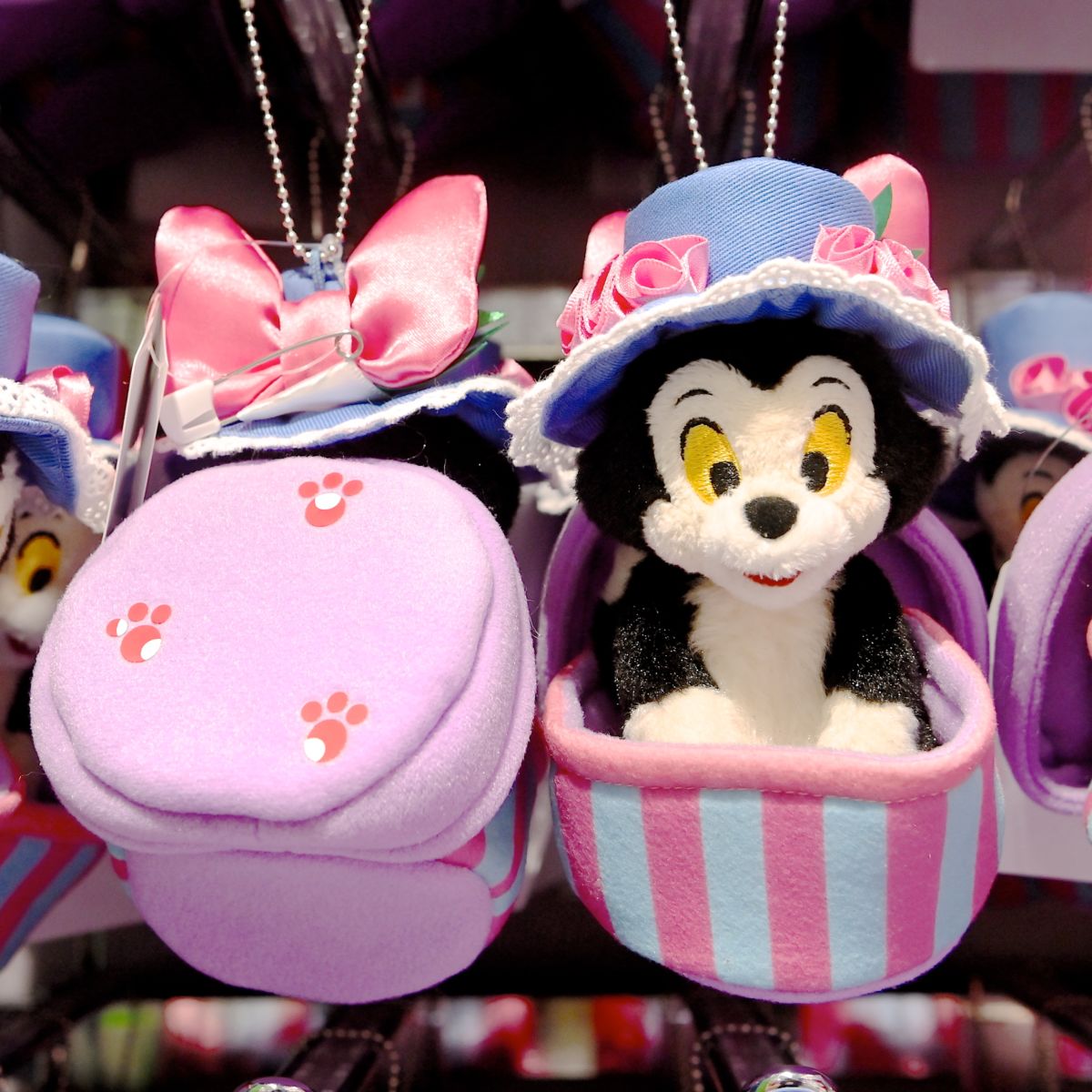 ワークルームでいたずらする「ミニーマウス」の愛猫の「フィガロ」のぬいぐるみバッジ。