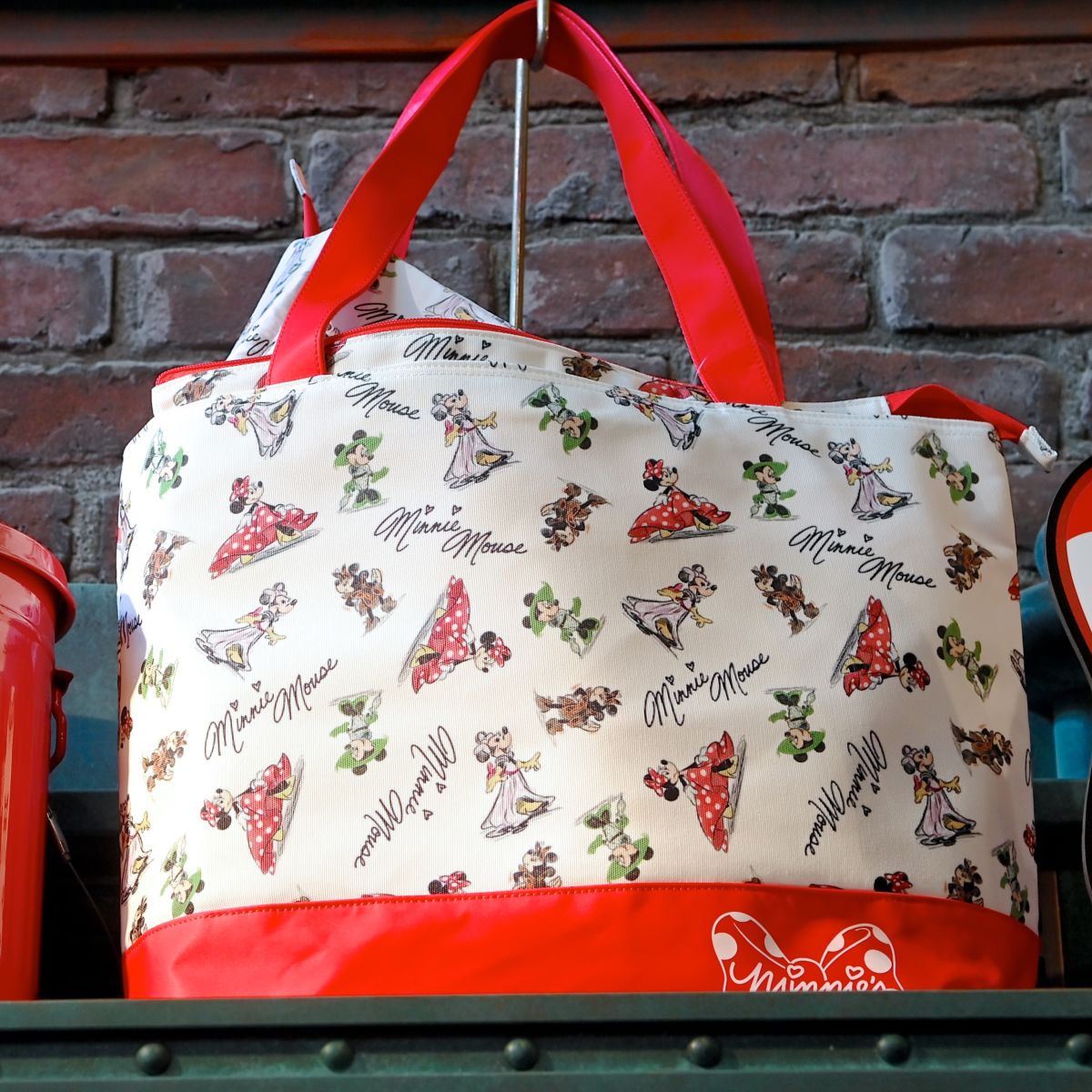 ファッショナブルなコスチュームを着た「ミニーマウス」とサインがデザインされた総柄トートバッグ。