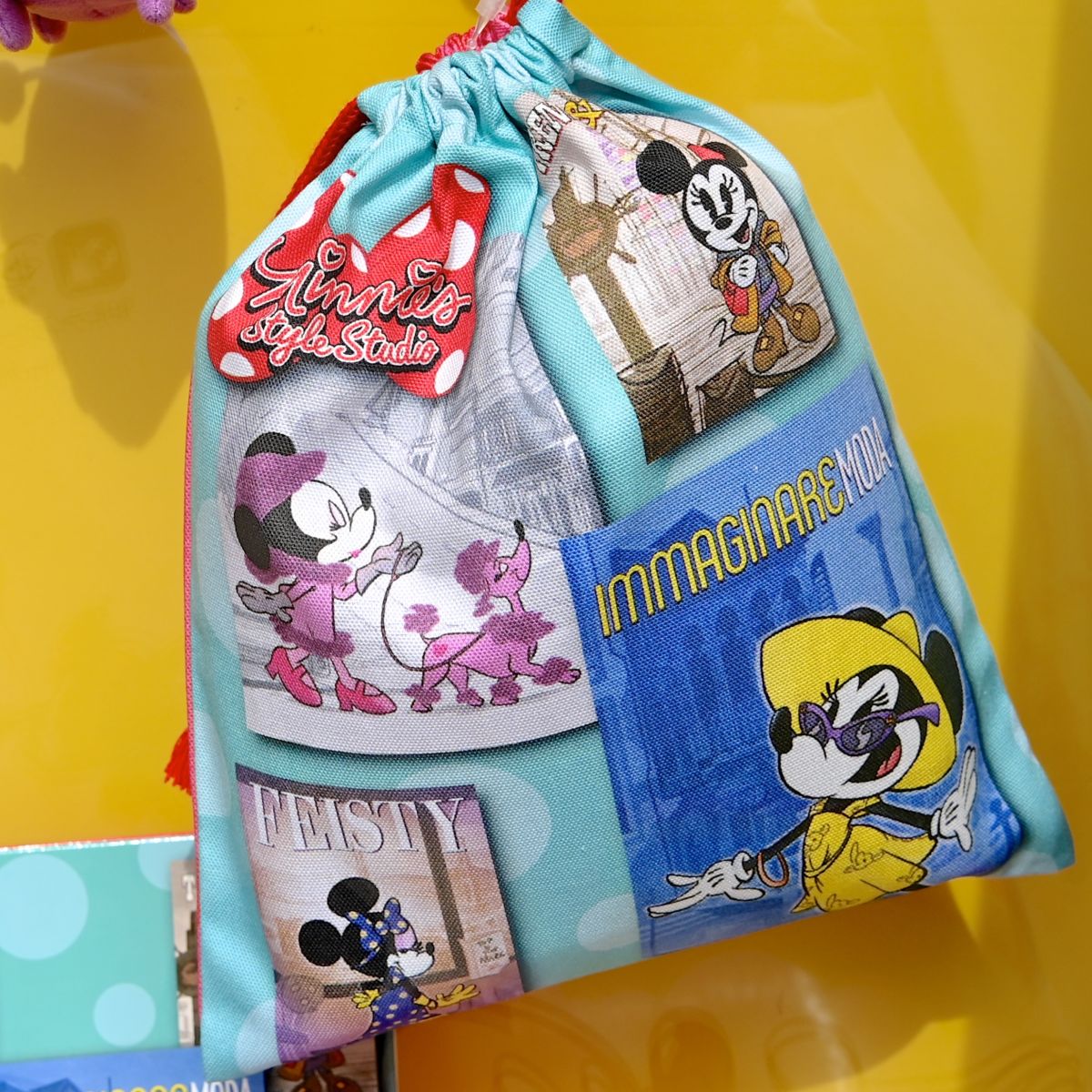 いろんなシーンの「ミニーマウス」がデザインされたきんちゃく。