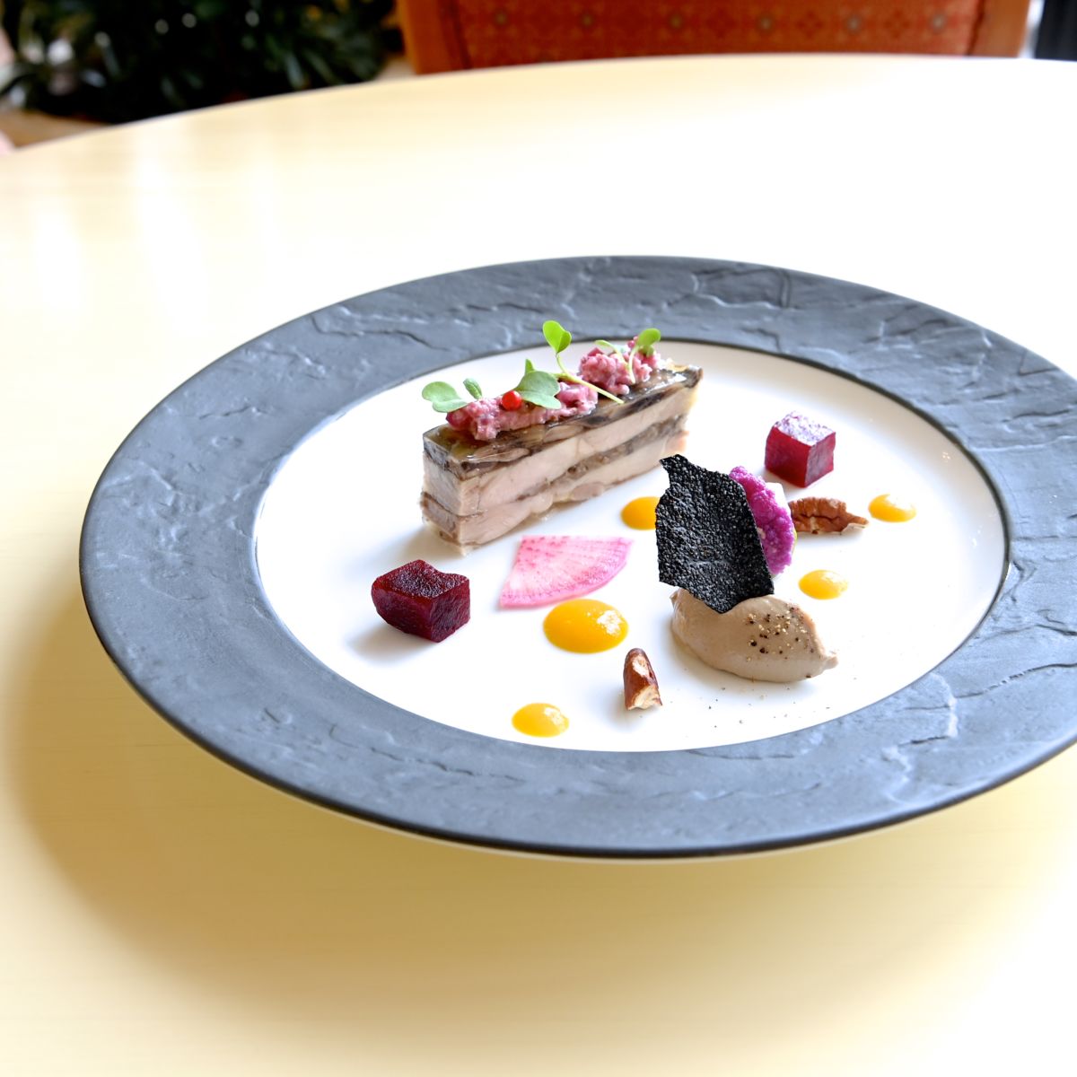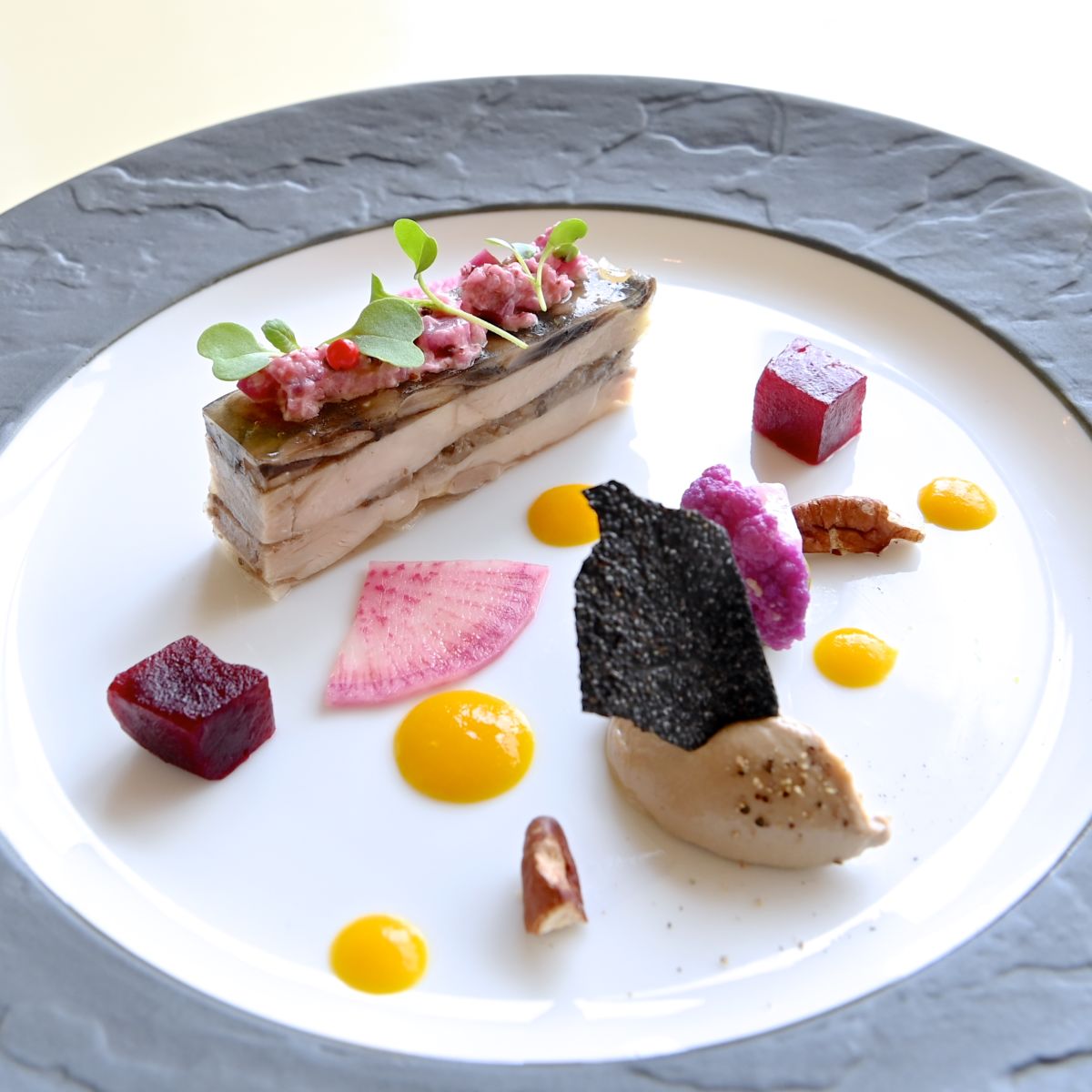 濃厚な白レバーのムースやビーツ、カリフラワー、ピーカンナッツなどと一緒にいただきます。