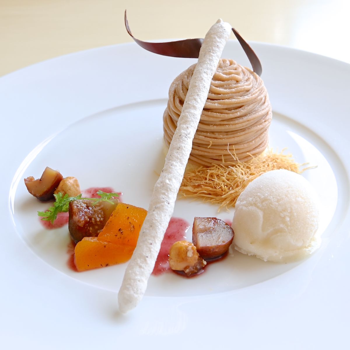 デザートは秋らしいモンブランとさっぱりいただける洋梨のソルベ。