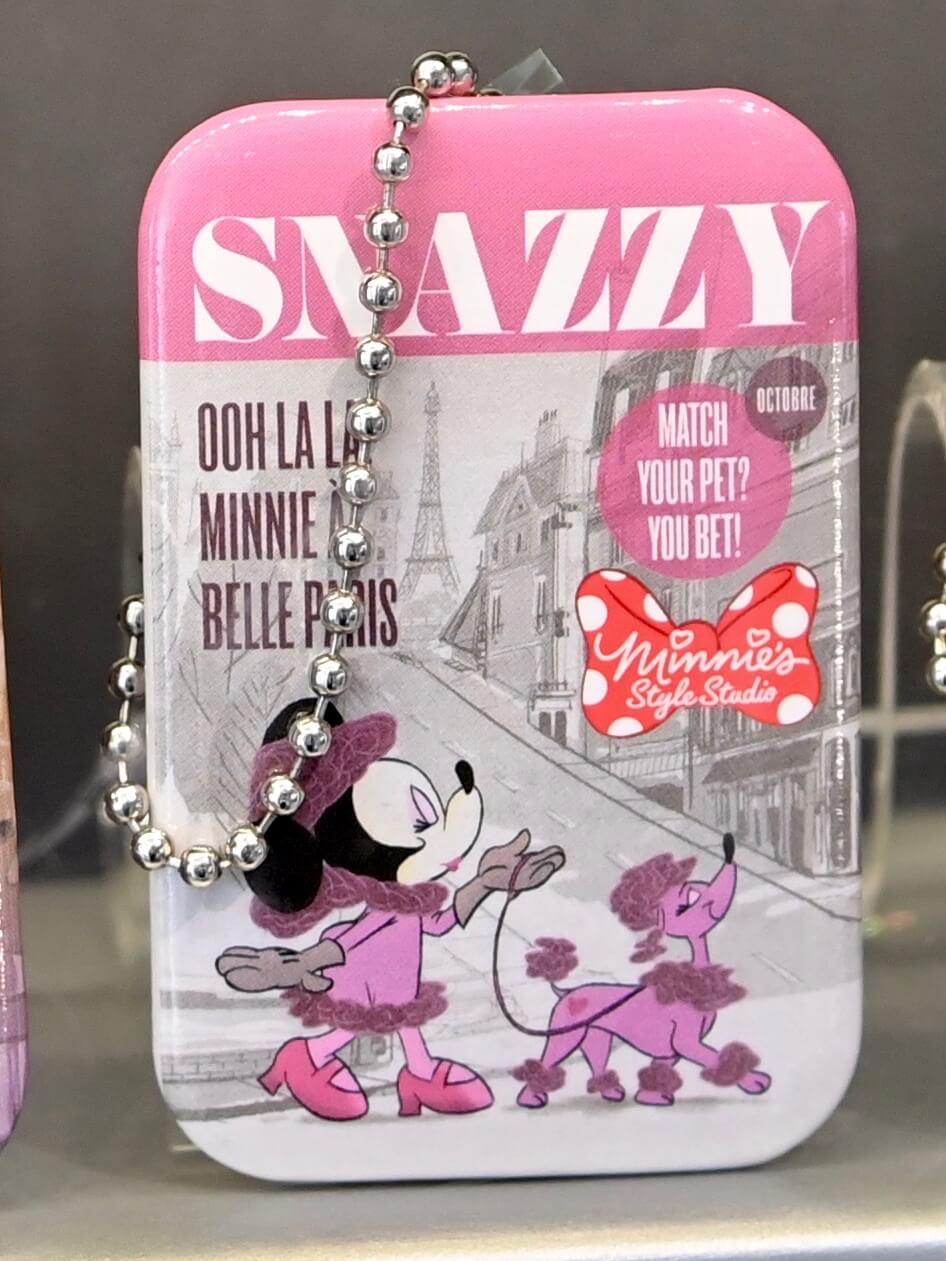新キャラクターグリーティング施設「ミニーのスタイルスタジオ」のロゴデザイン入りカンバッジチャーム。