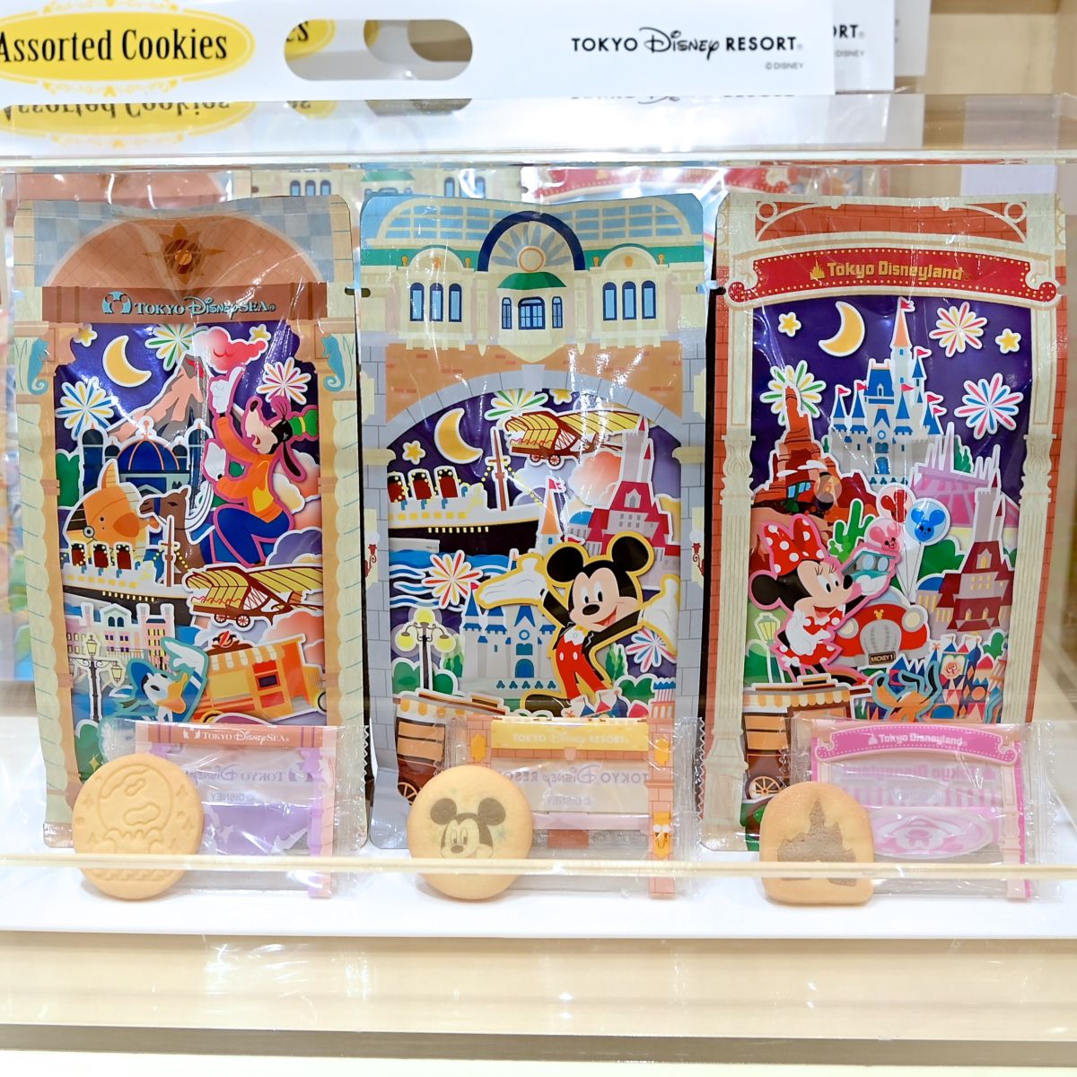 リゾート内の風景を背景にしたデザイン!東京ディズニーランド「ミッキー&フレンズ」クッキーの紹介でした。