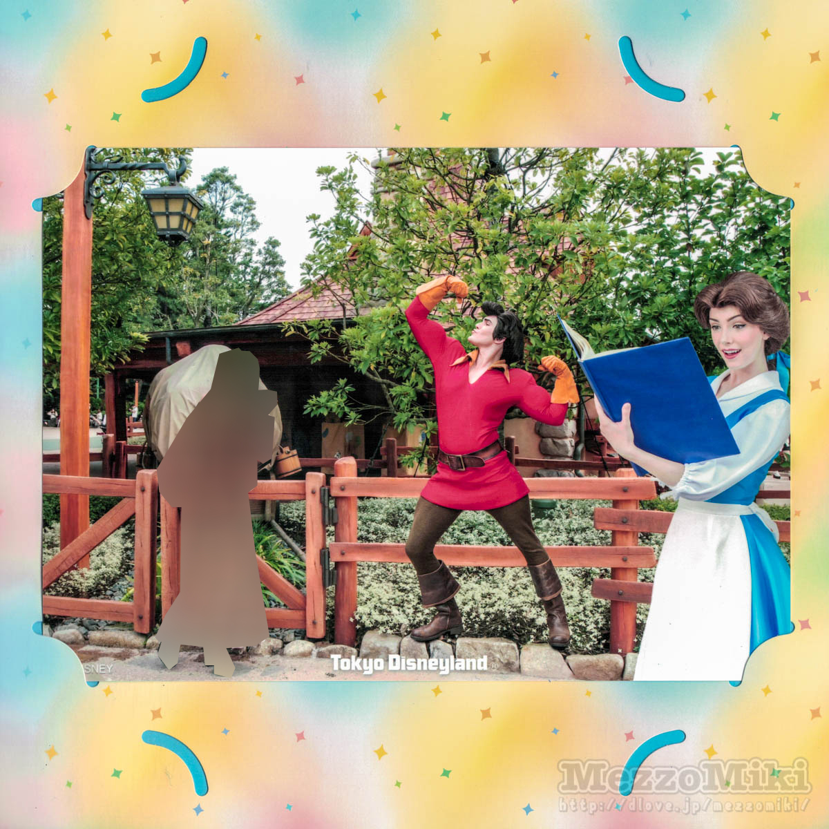 モーリスのコテージ前では、ガストンとベルが登場する写真が撮影できます。