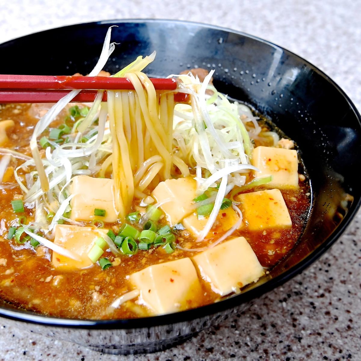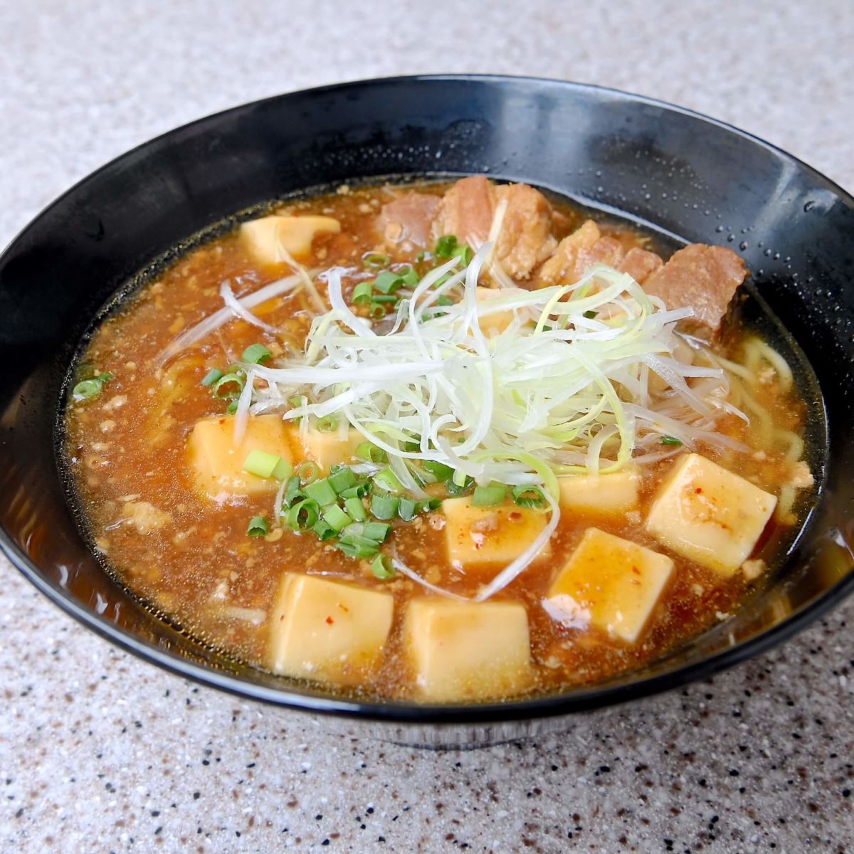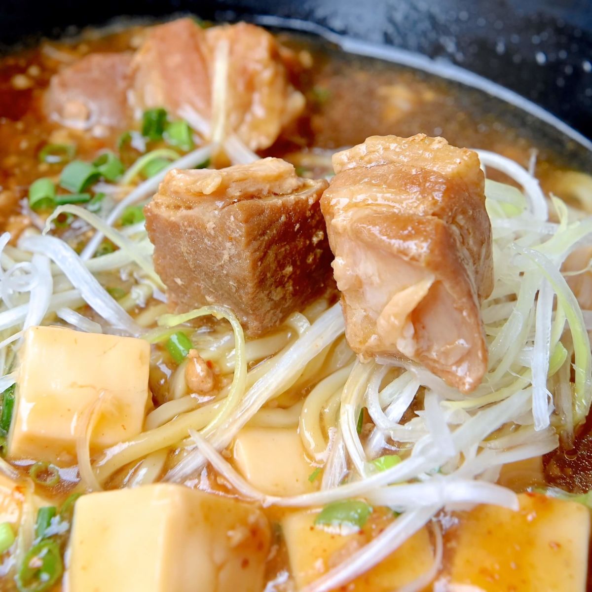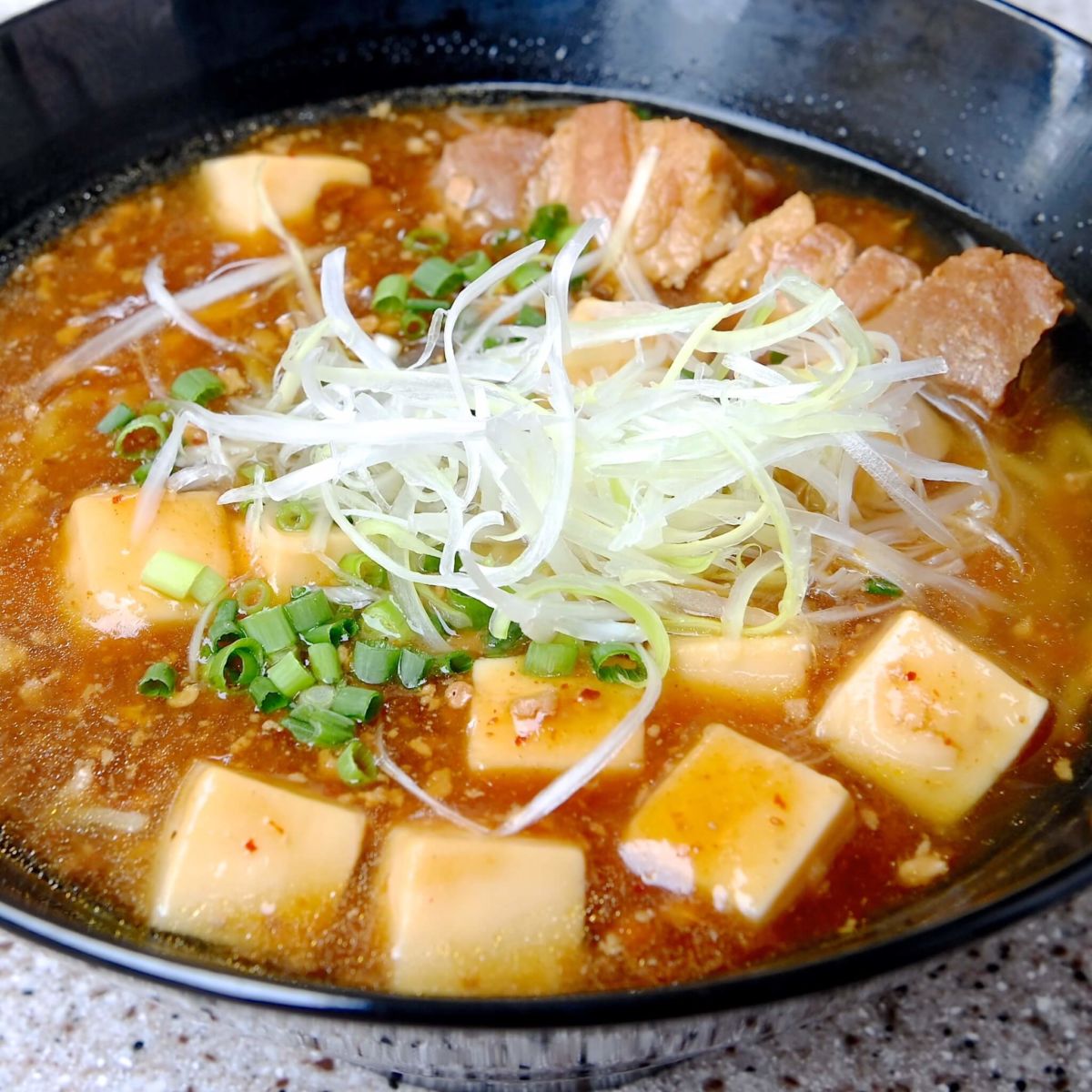 ゴロゴロとしたジューシーで、脂の甘味が活きた豚の角煮とひき肉がたっぷりはいった本格的な麻婆豆腐がトッピングされています☆