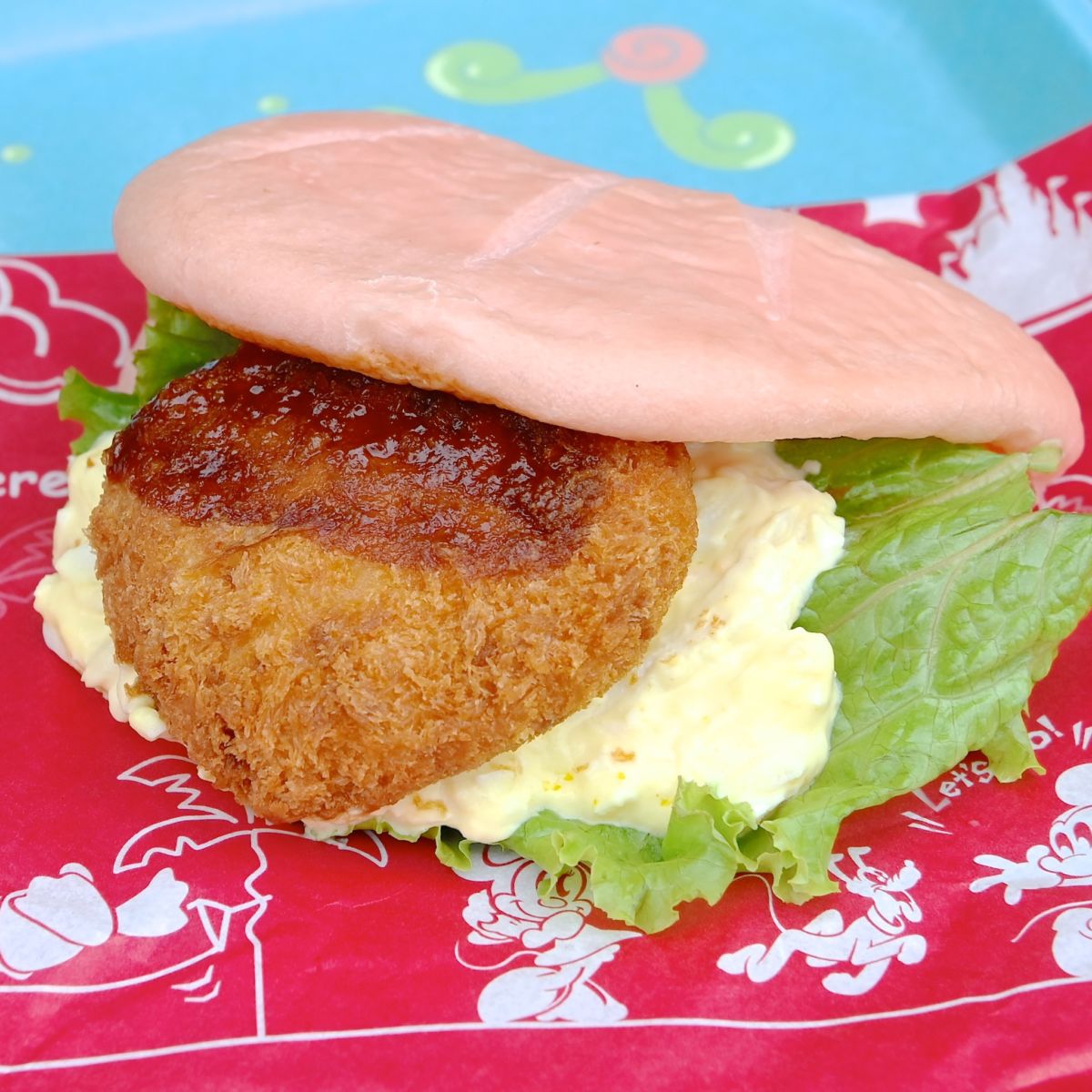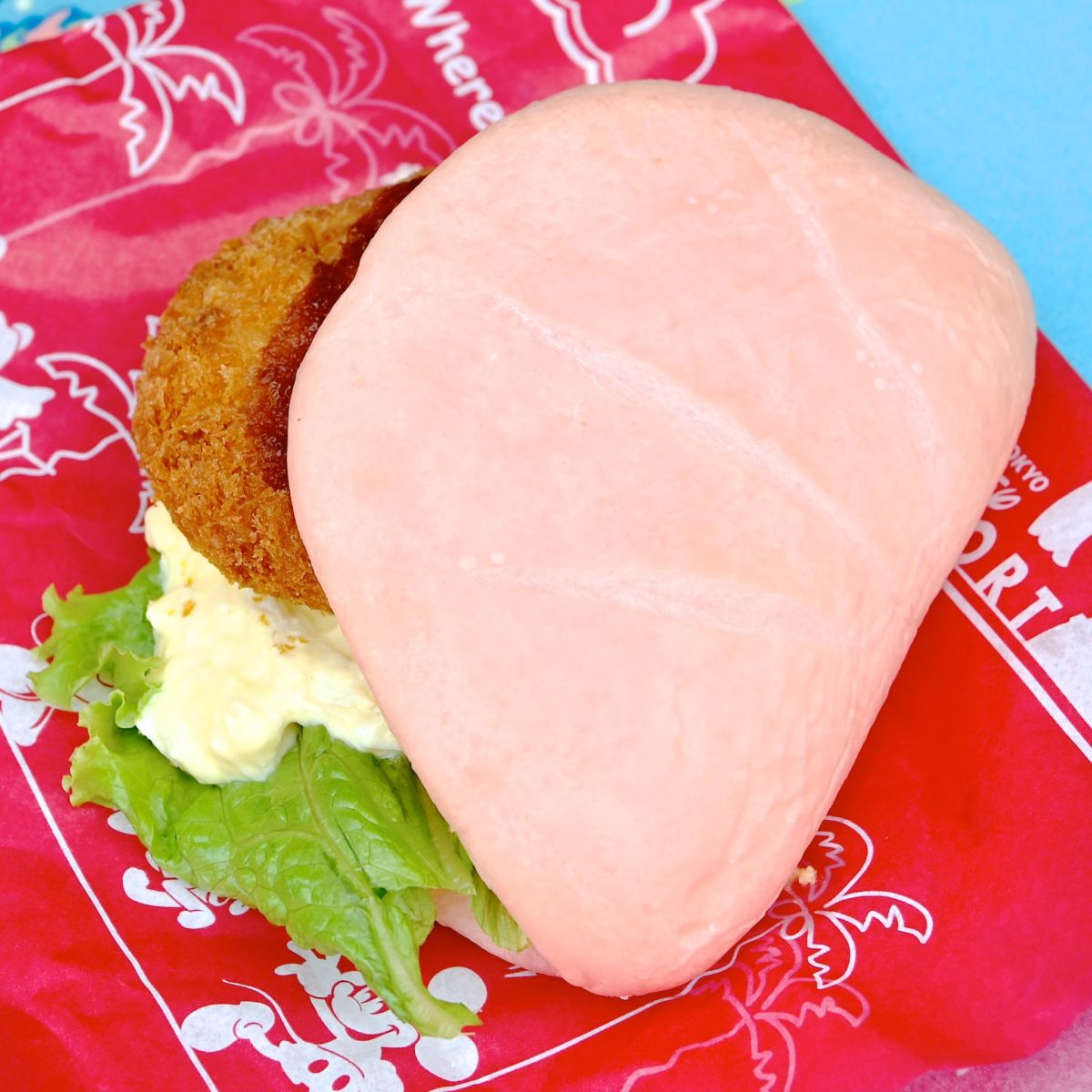 ピンク色の貝のかたちをしたパンズにサンドされたかわいいエビカツサンド。