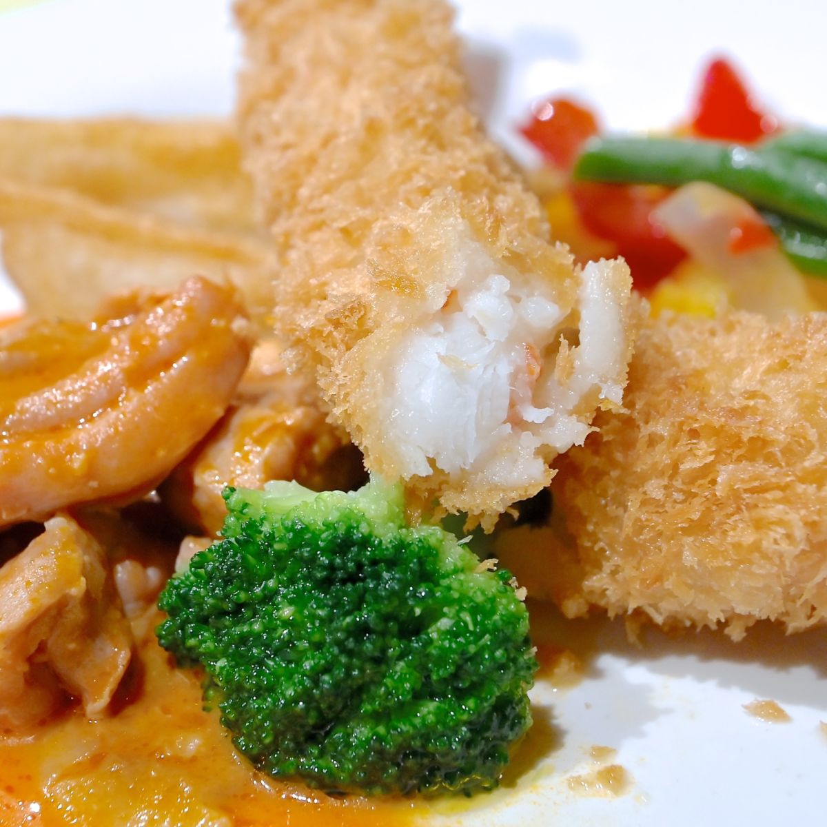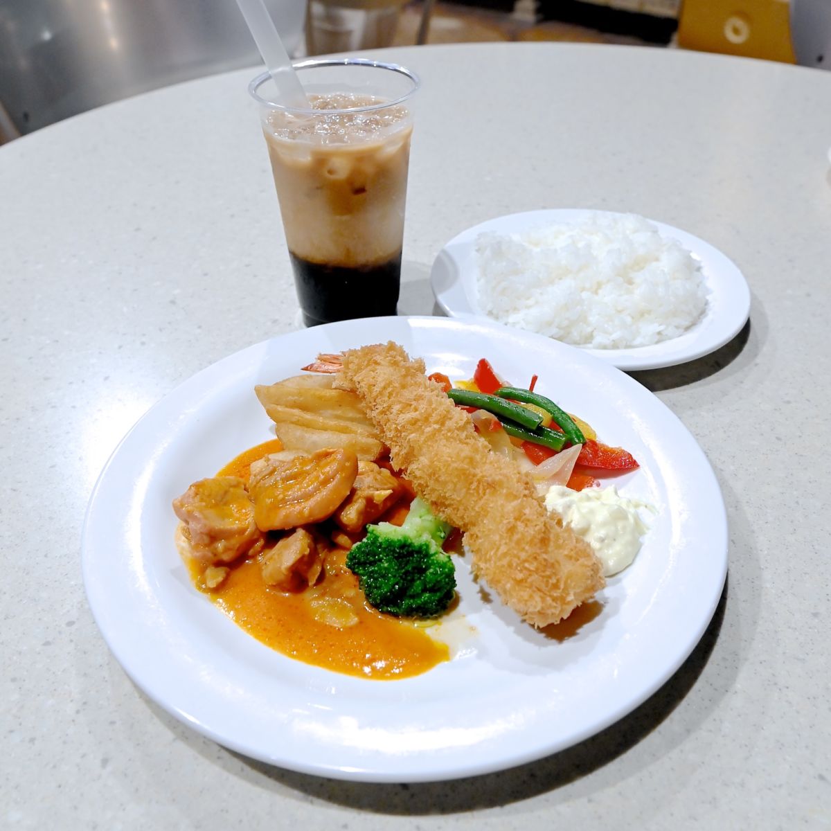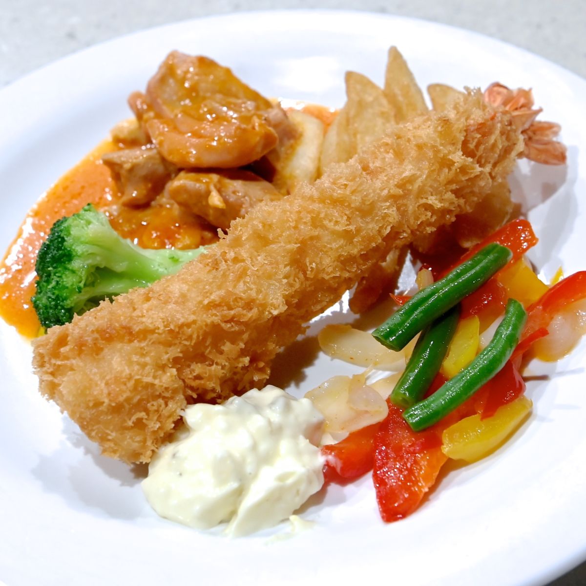 あげたての海老フライに、タルタルソース、チキン、色鮮やかなお野菜、フライドポテトが味わえる満足度の高いメインメニュー。