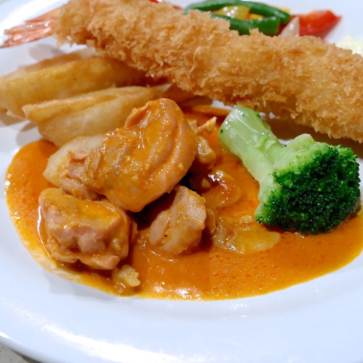 グリルドビーフ、ハンバーグ、チキンのオーブン焼き、サーモンのグリルなどに加え10月1日よりシェフのおすすめアントレ、エビフライとチキンのトマトクリーム煮が提供されています☆