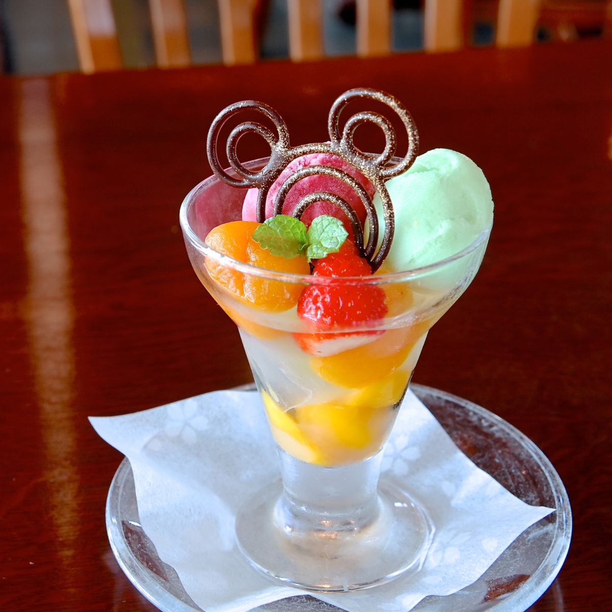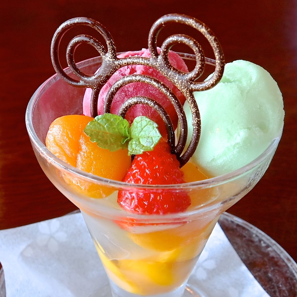 ミッキーモチーフの「フルーツとわらび餅のパフェ」☆
