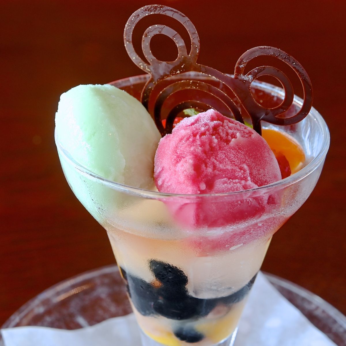 甘酸っぱいラズベリーと爽やかなメロンのシャーベット、ミント、金箔が付いたミッキーシェイプのチョコレートがトッピングされています。