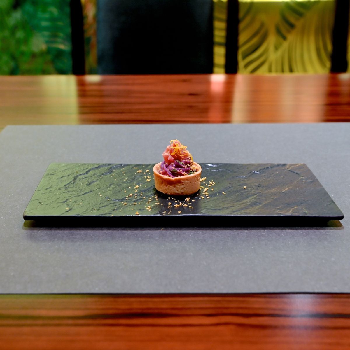 アミューズは、紫芋のムースと生ハムのタルト☆