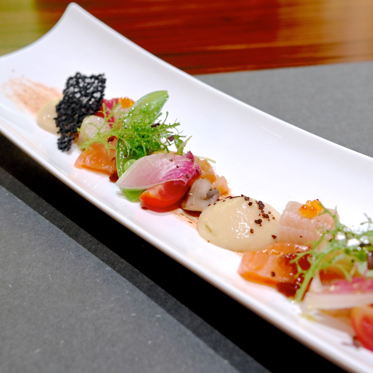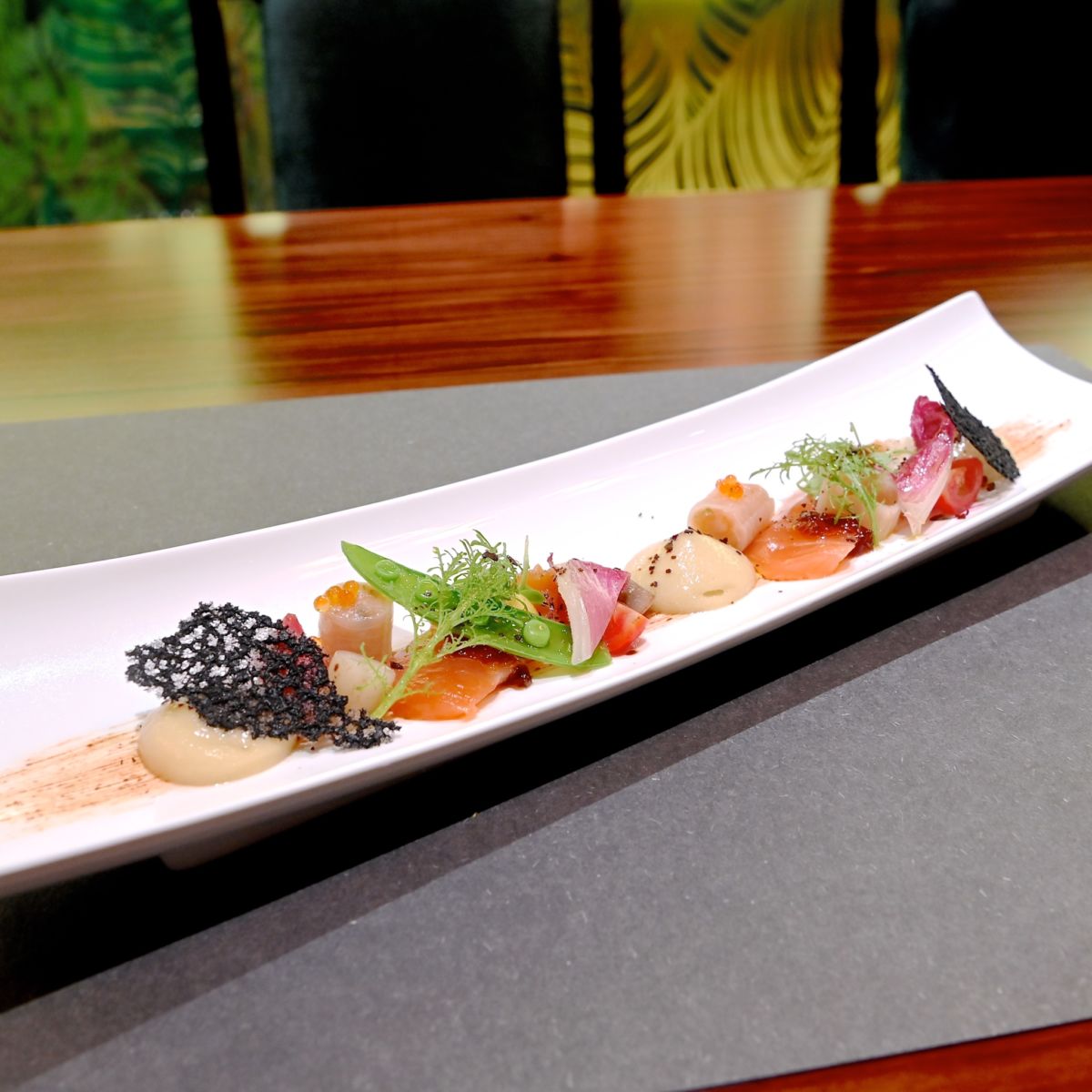 サーモンマリネと柚子醤油ジュレ 秋野菜のグレック 焼きナスのエスプーマ