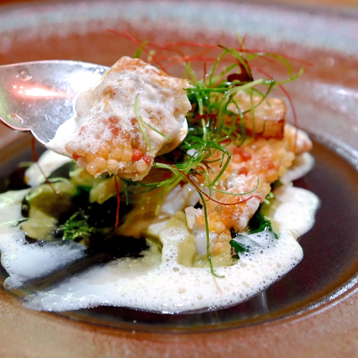 アラレを纏ったイトヨリ鯛のポワレ 西京味噌香る豆乳のエキューム