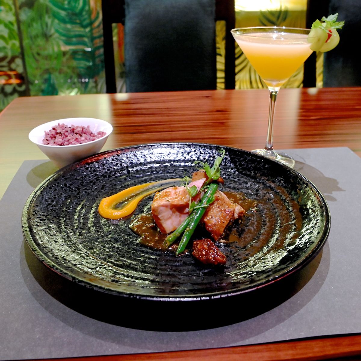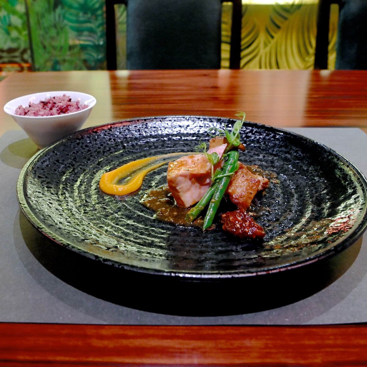 ピリッと辛い焼き葱のピュレ、豆乳と西京味噌のソースと一緒にいただきます。