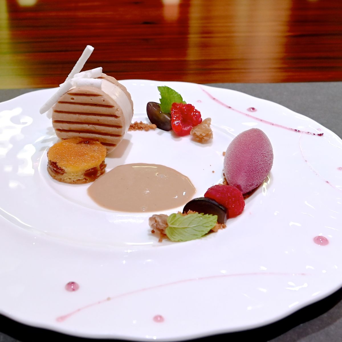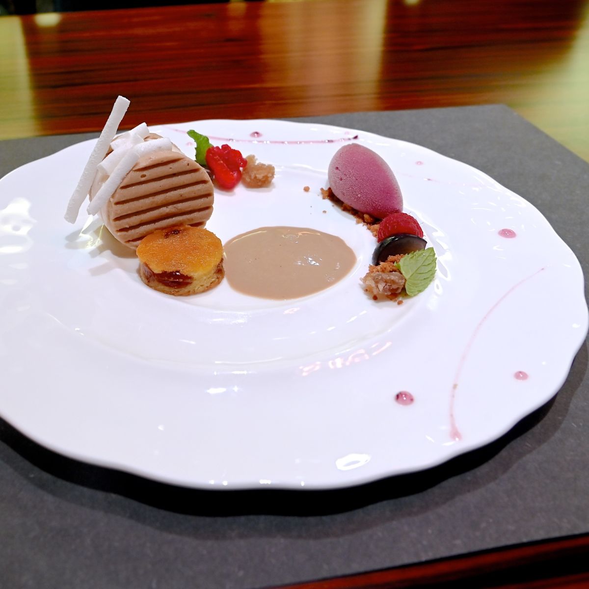 デザートはメレンゲがトッピングされた秋が旬のマロンのケーキとサルタナレーズンのフランジパーヌ、巨峰のソルベ。