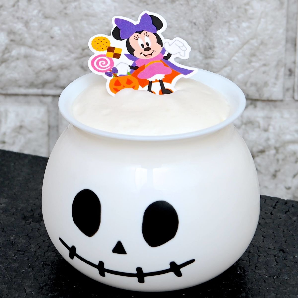 ガイコツをモチーフにした器に入った、ハロウィン限定ミルクプリン。