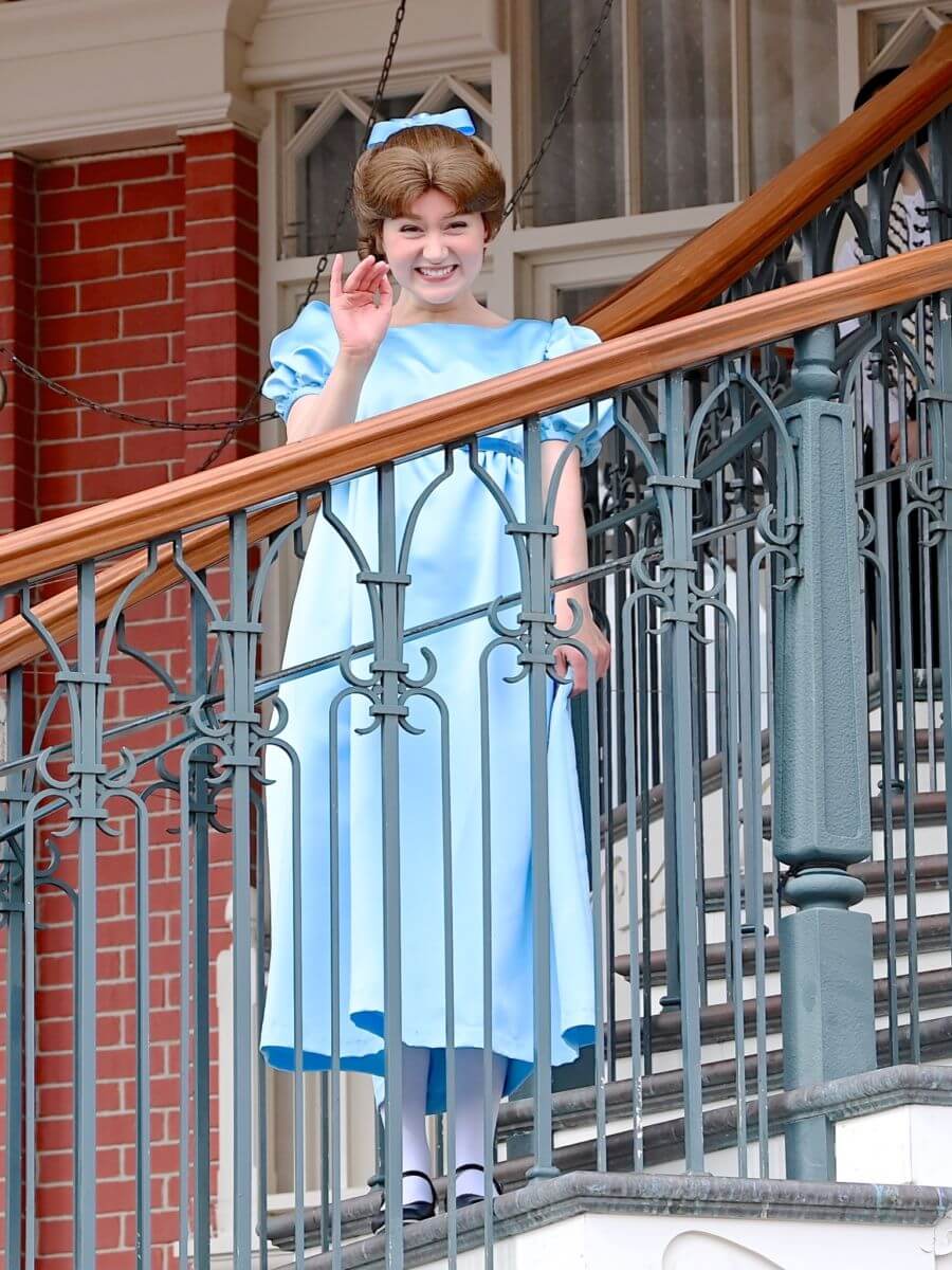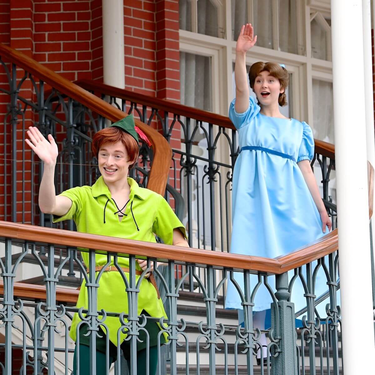 東京ディズニーランド/ワールドバザールにあるレストラン「リフレッシュメントコーナー」の前にある階段にディズニーアニメーション映画『ピーター・パン』の「ピーター・パン」と「ウェンディ」がご挨拶に登場!