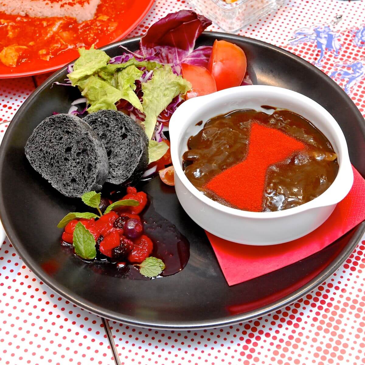 「アベンジャーズ」シリーズの紅一点「ブラック・ウィドウ」をイメージしたイカ墨グラタン。