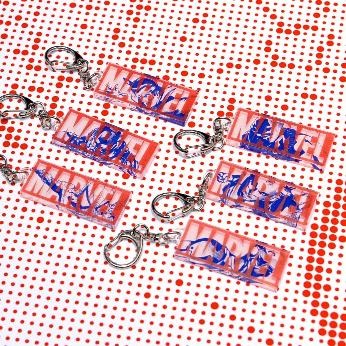 マーベルロゴとヒーロー6人がデザインされたアクリルキーホルダー。