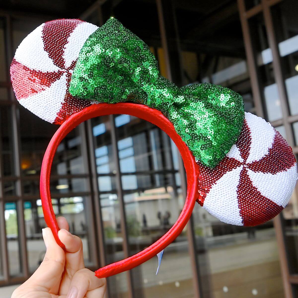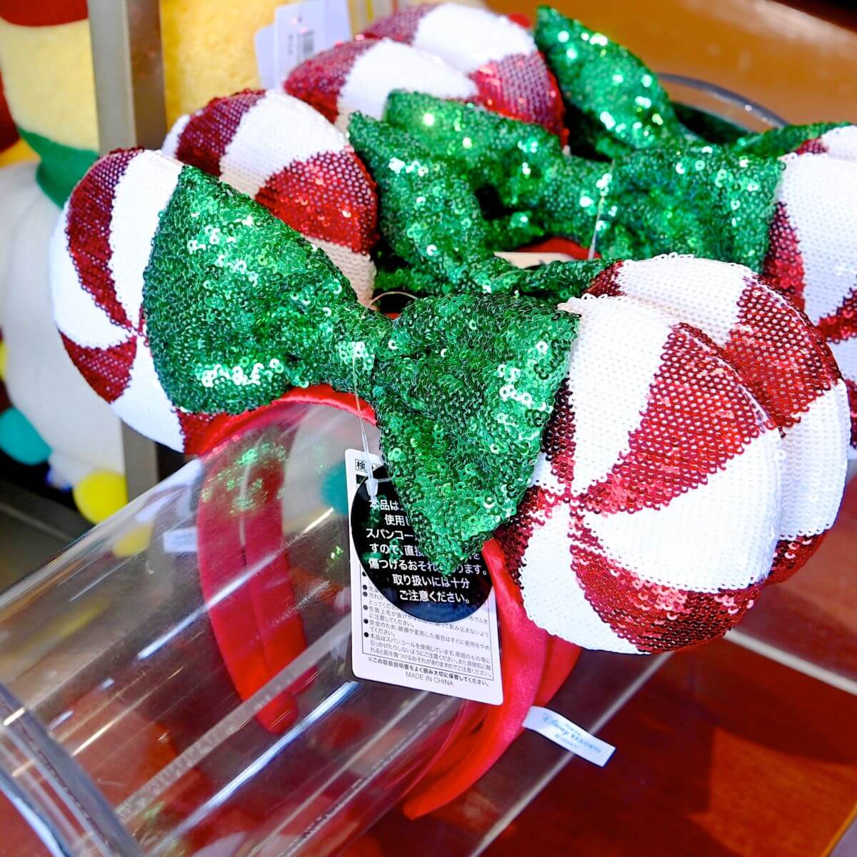 キャンディケインカラーのスパンコール!東京ディズニーランド ミニーマウスカチューシャの紹介でした。