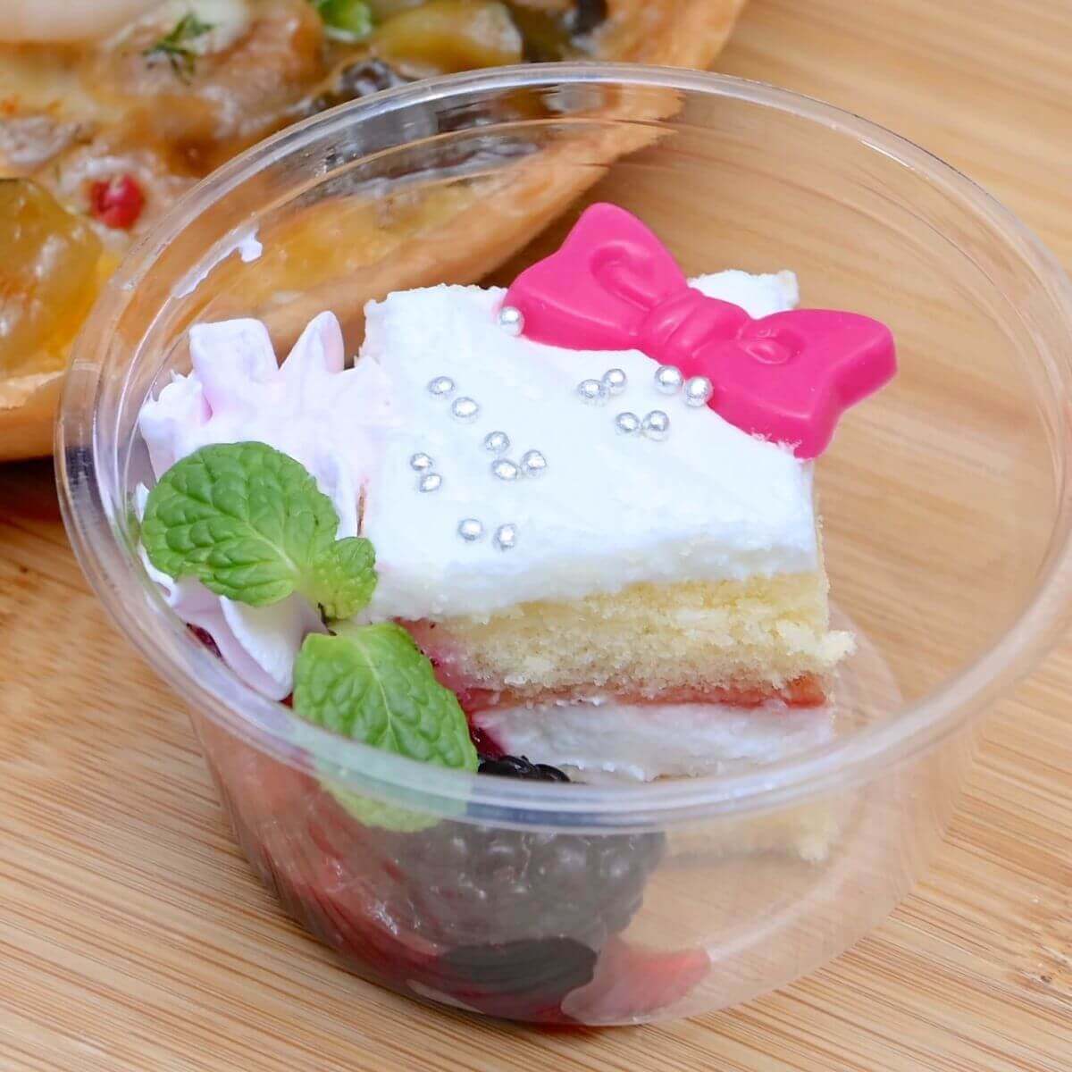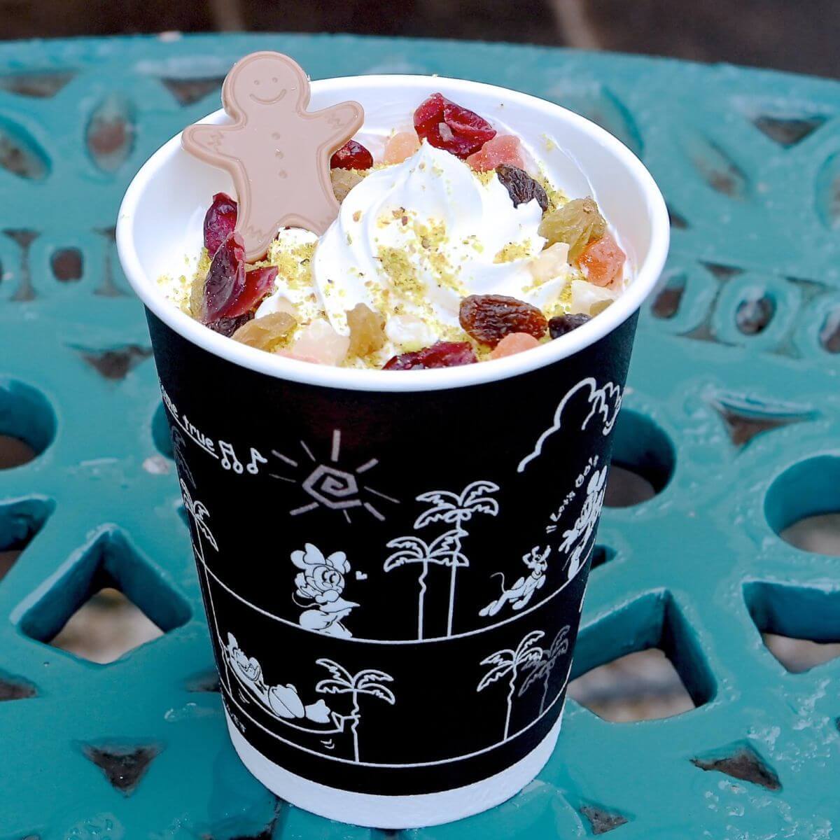 ホイップクリーム、ピスタチオパウダー、たっぷりのドライフルーツ、アイシングクッキー型のチョコレートがかわいくトッピングされています。