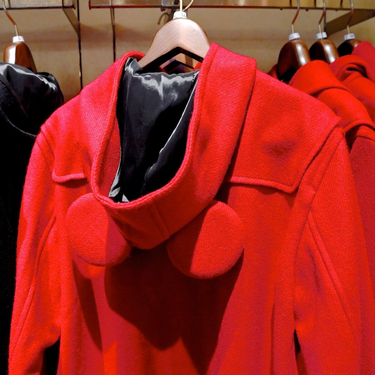 一見シンプルなダッフルコートですが、フードのミッキーマウスのお耳がさりげないアクセントになっています☆