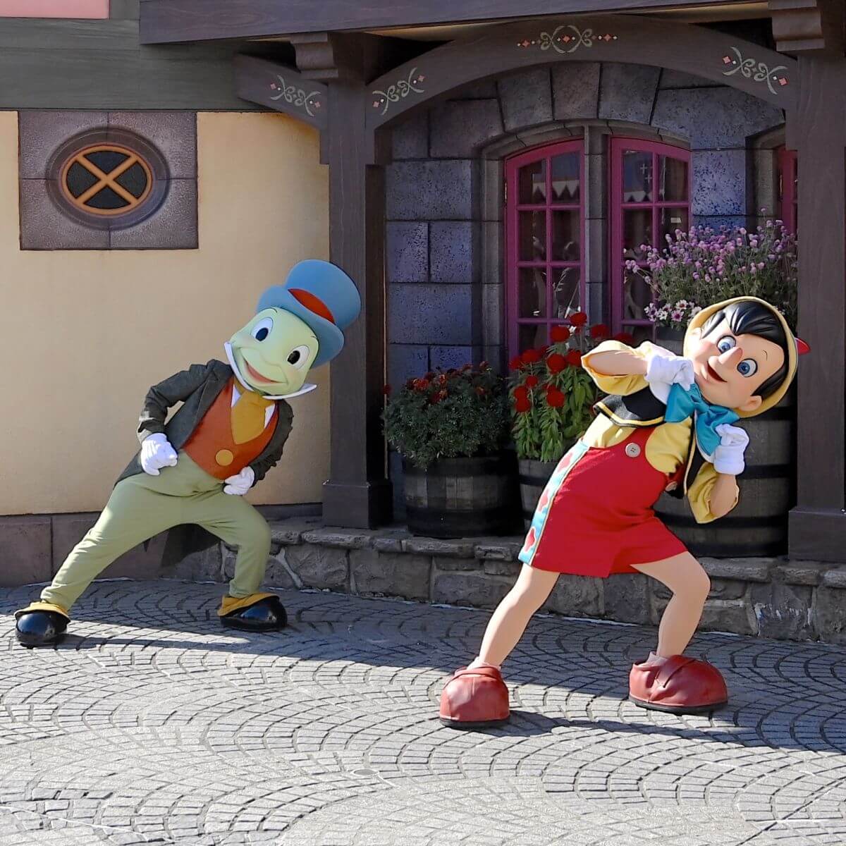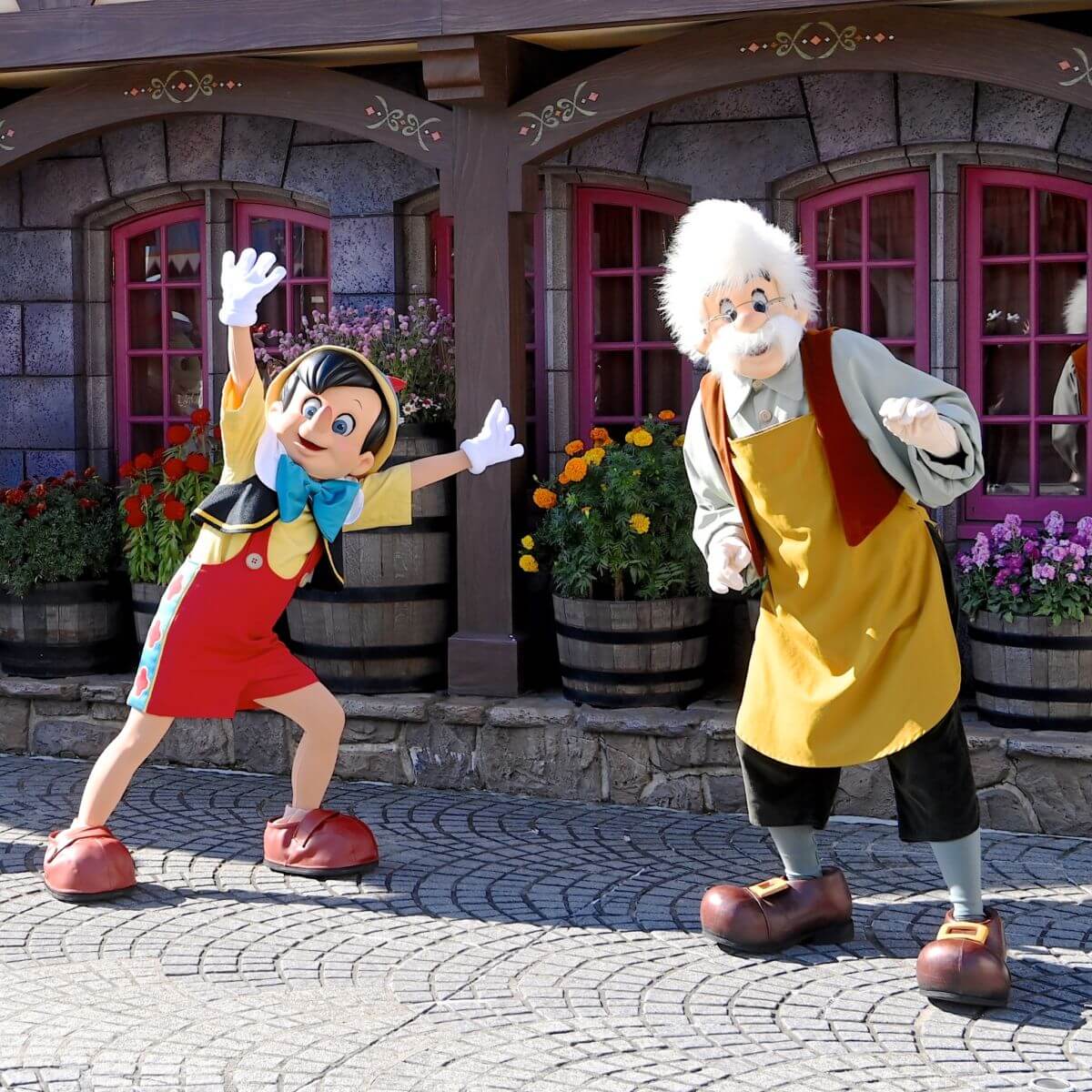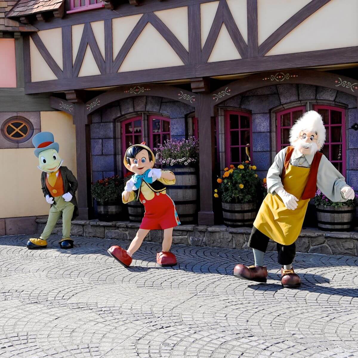 『ピノキオ』の主人公、操り人形の「ピノキオ」とピノキオを作ったやさしいお父さん「ゼペット」、ピノキオの良心役の「ジミニー・クリケット」たちは「ブレイブリトルテイラー・ショップ」の前でグリーティング。