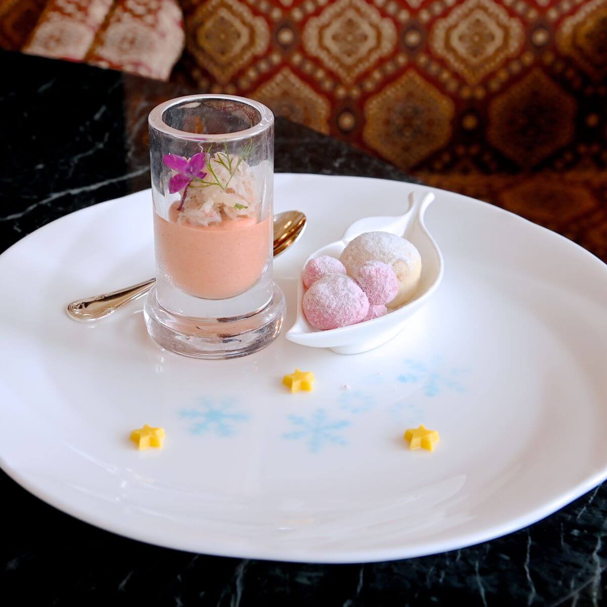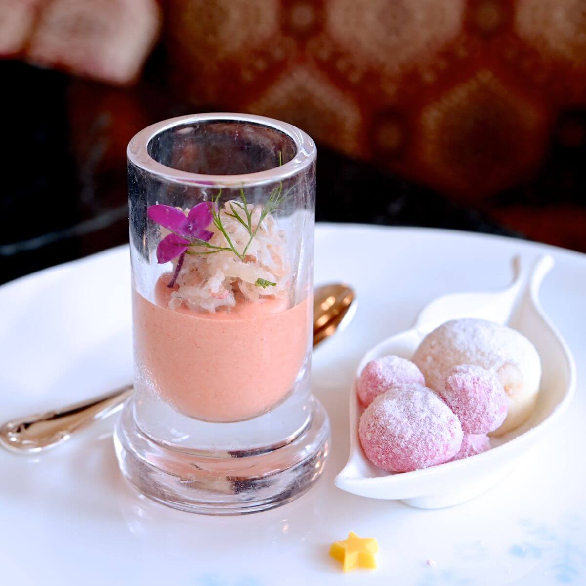 赤ピーマンのムースと紅ズワイガニのタルタルとブールドネージュ(スノーボールクッキー)と生マシュマロとも呼ばれるもちっとしたミッキーシェイプのギモーヴのプレート。