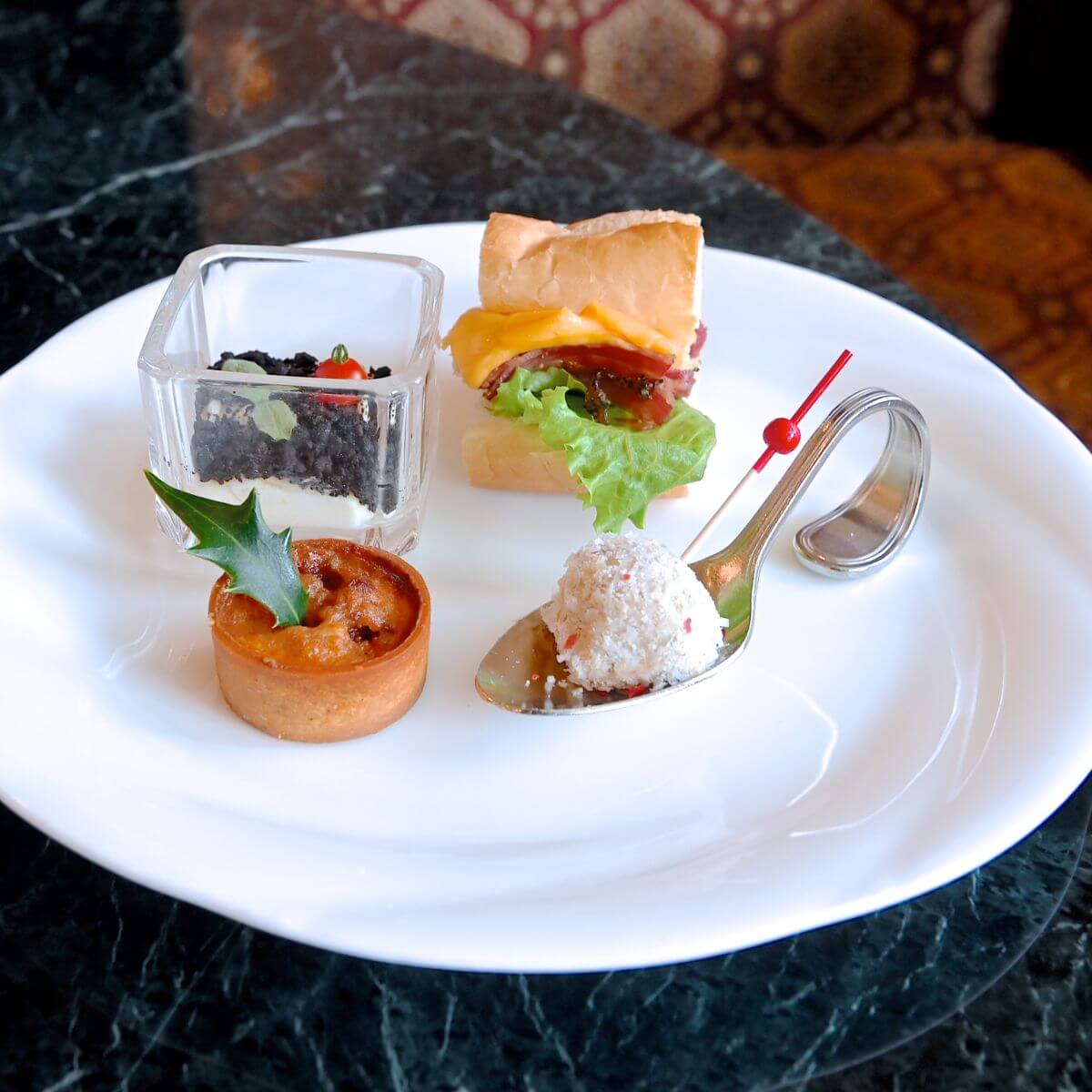 サンドウィッチ&オードブルは、クリスマスらしく赤、緑、白のカラーがきれいなプレート。