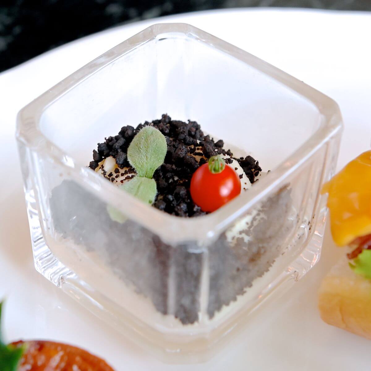 植木をイメージした真鯛のブランダードとオリーヴのパウダー。