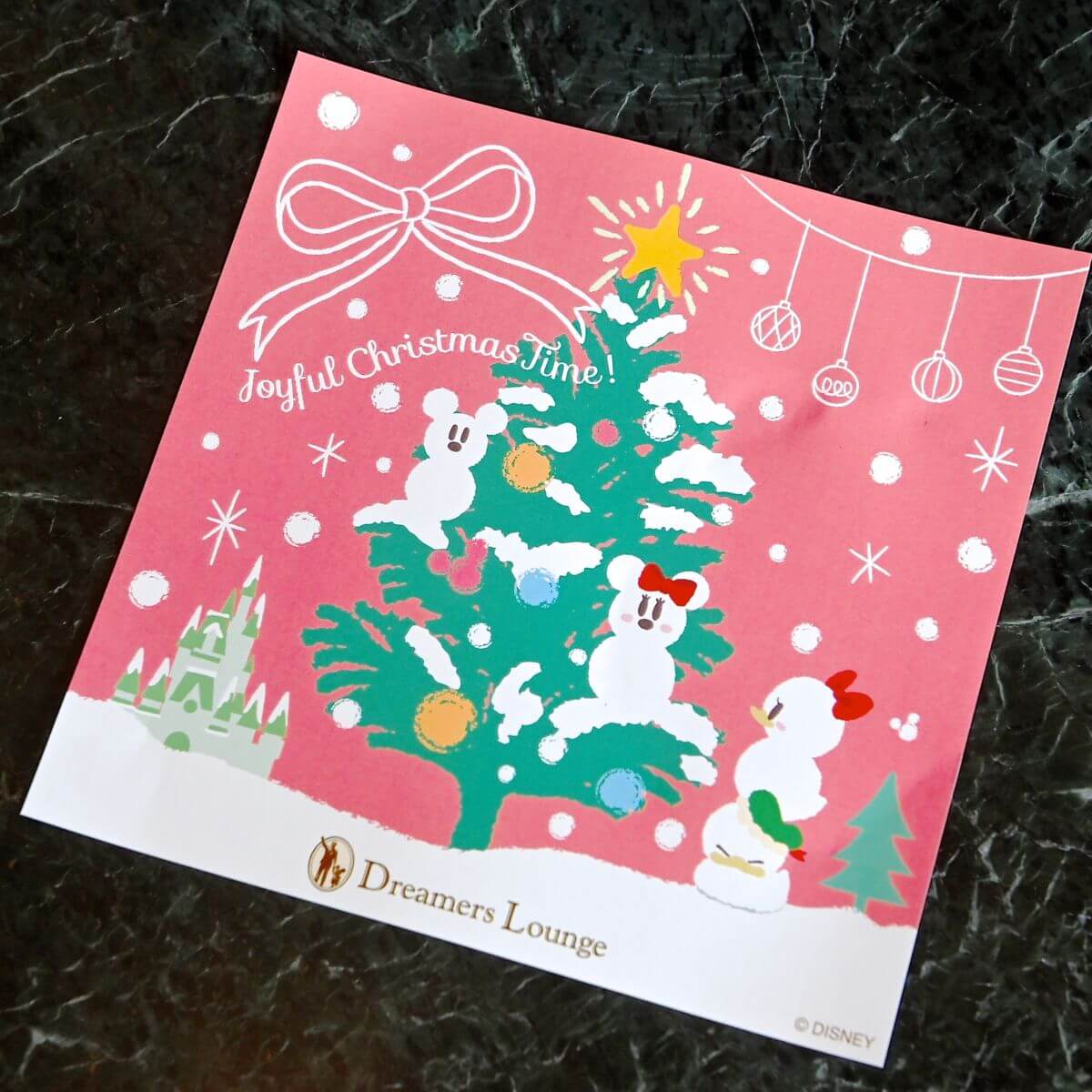 下にはシンデレラ城とクリスマスツリー、スノーミッキー、スノーミニー、スノードナルド、スノーデイジーがデザインされた紙が敷かれています。
