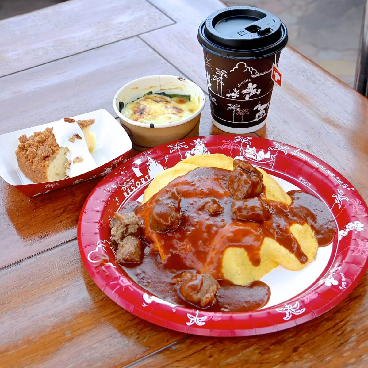 ビーフデミグラスソースのオムライス、ほうれん草とコーンのミニグラタン付き
