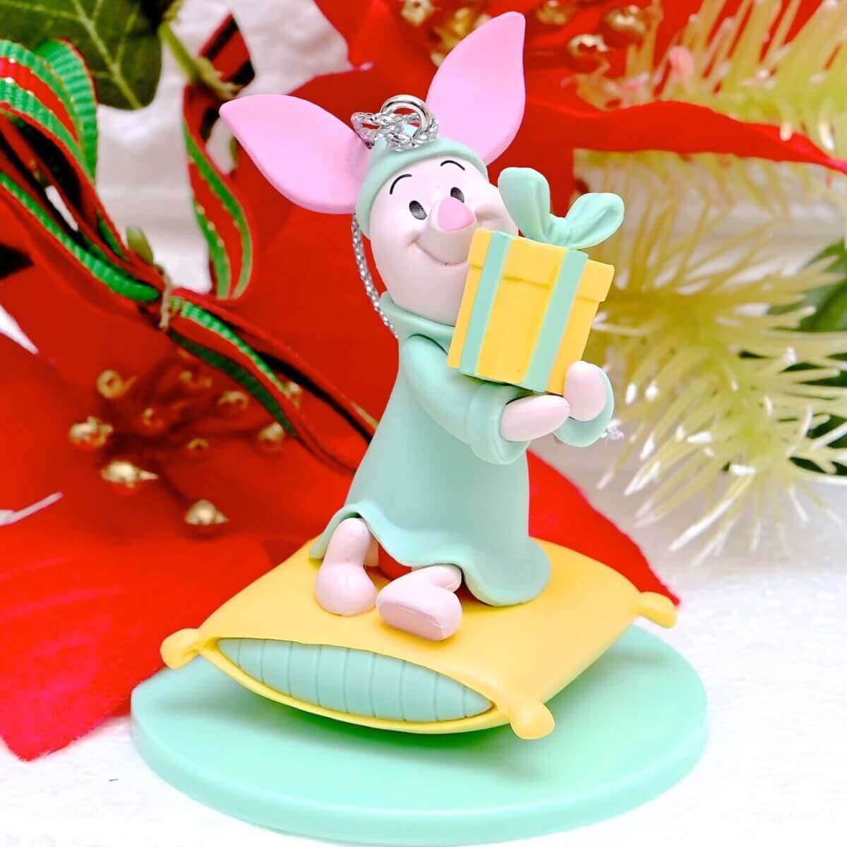 「黄緑」のパジャマを着てクッションの上でプレゼントを持っている「ピグレット」、