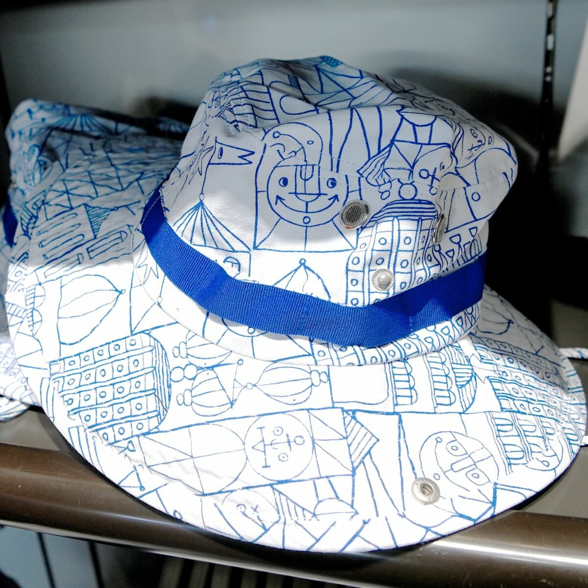 白地に青で手描き風にデザインされた人気アトラクション「イッツ・ア・スモールワールド」のハット。