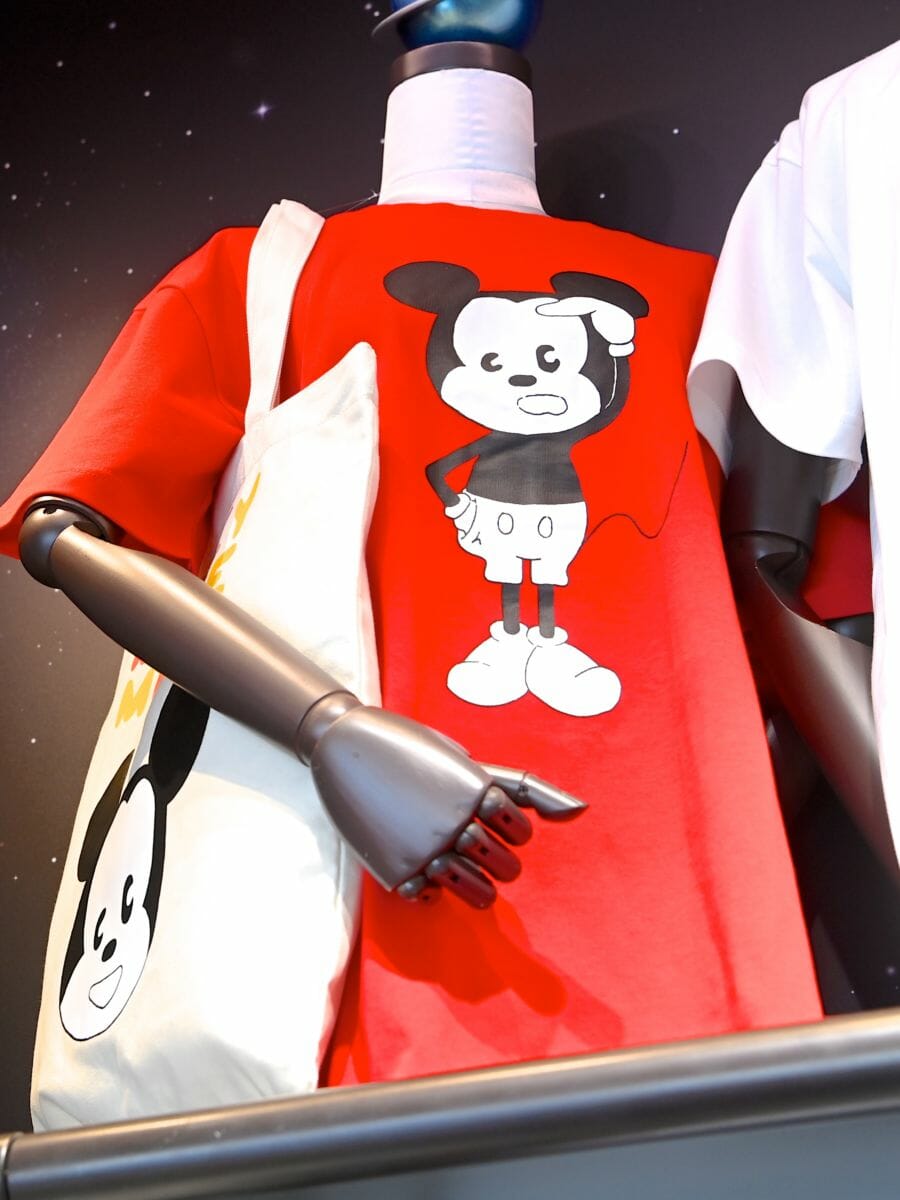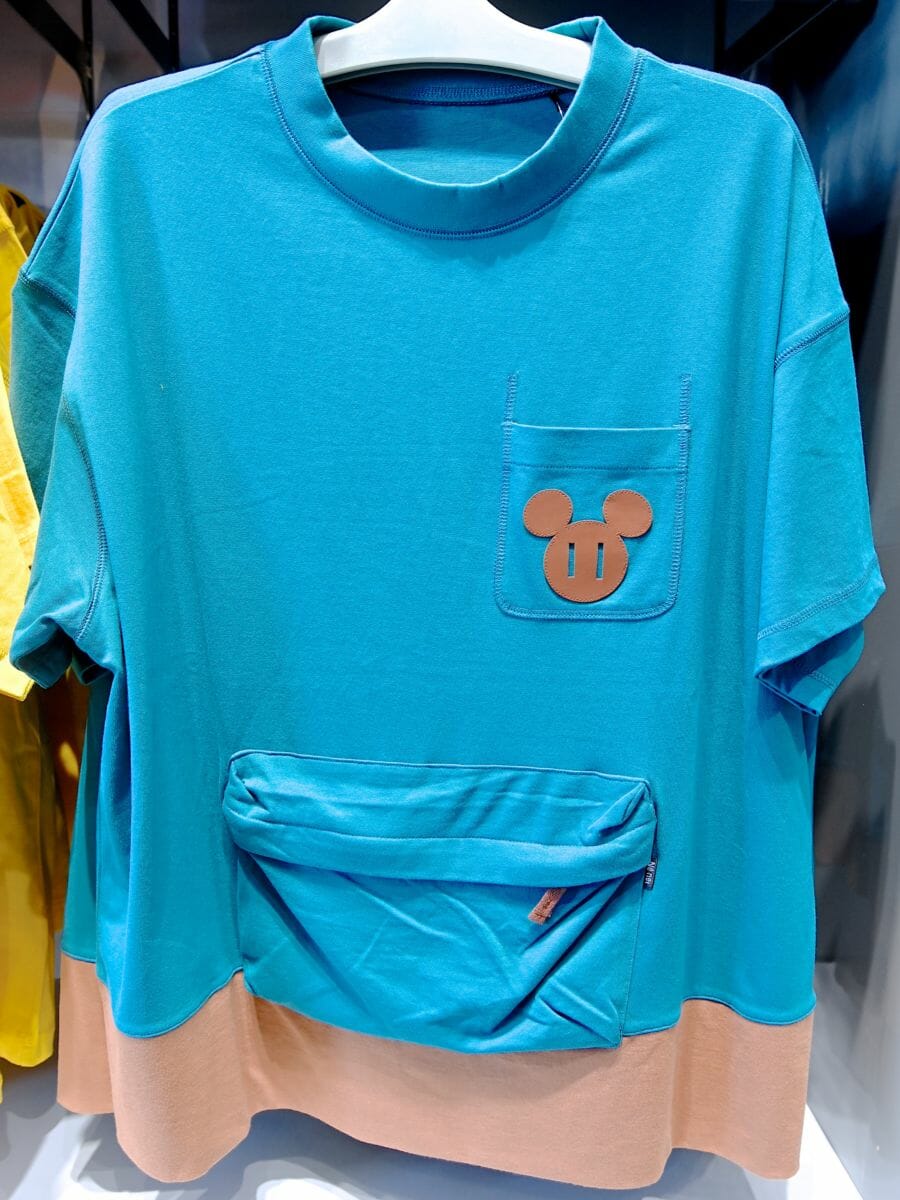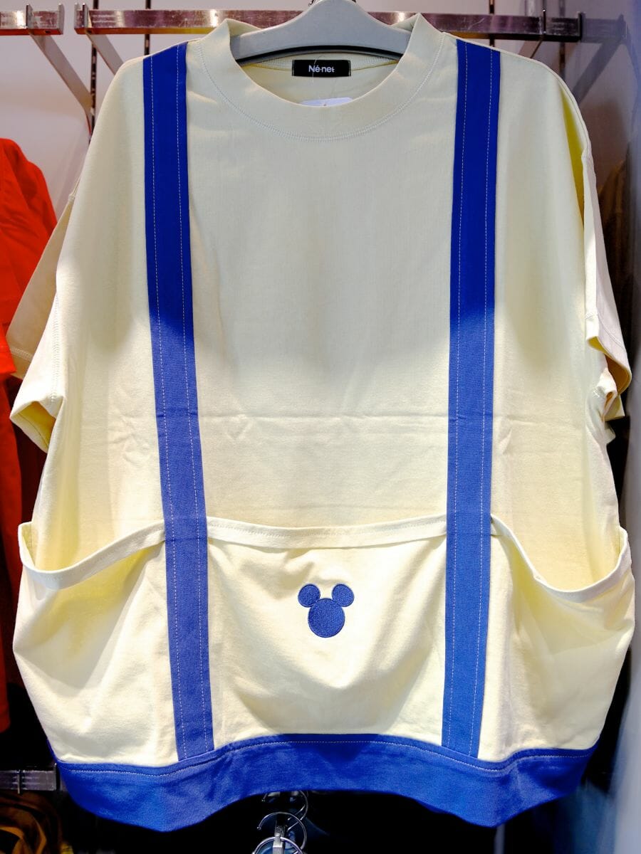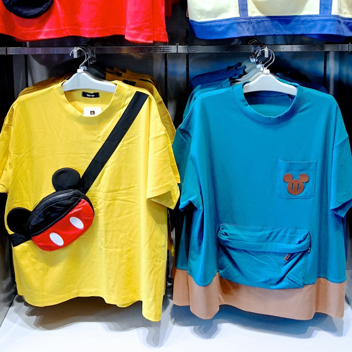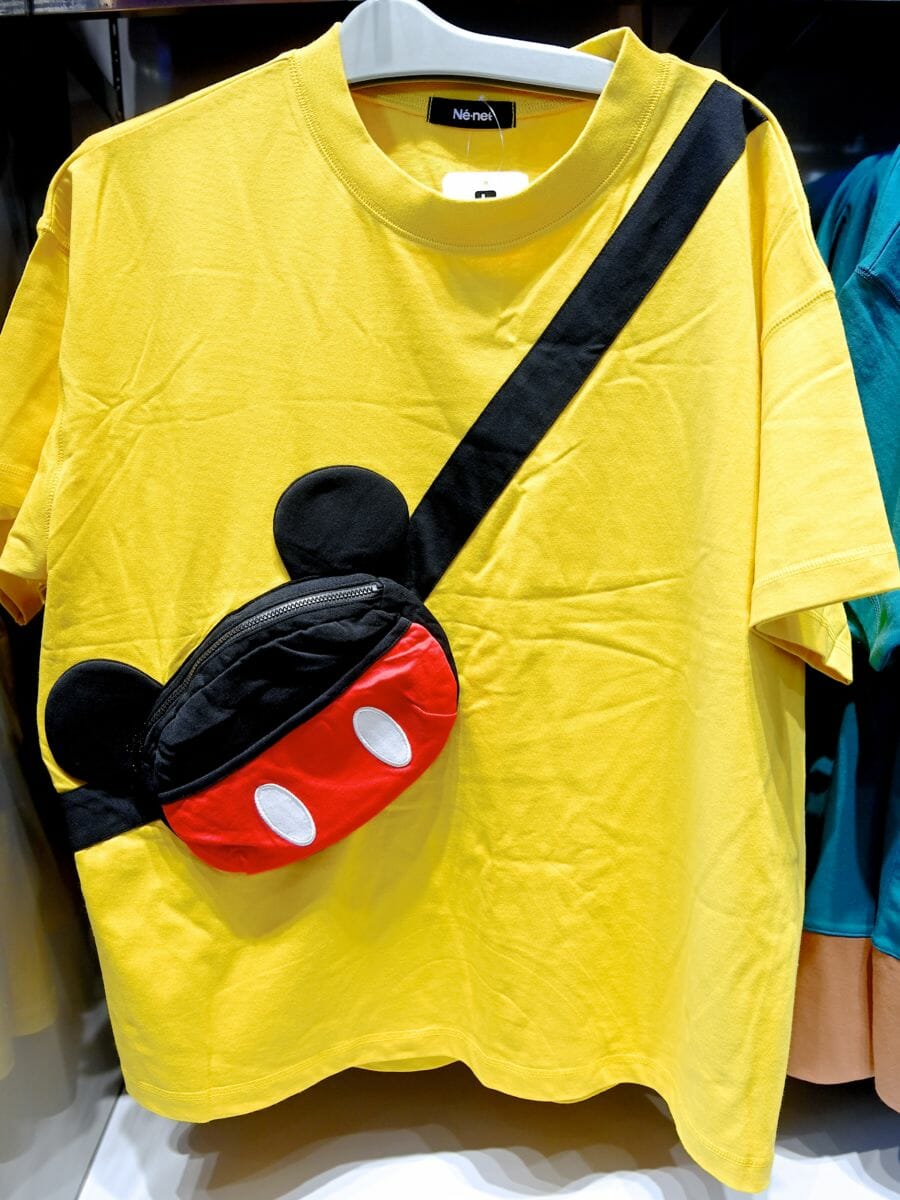 ミッキーシェイプのポシェットをつけているように見えるTシャツ。
